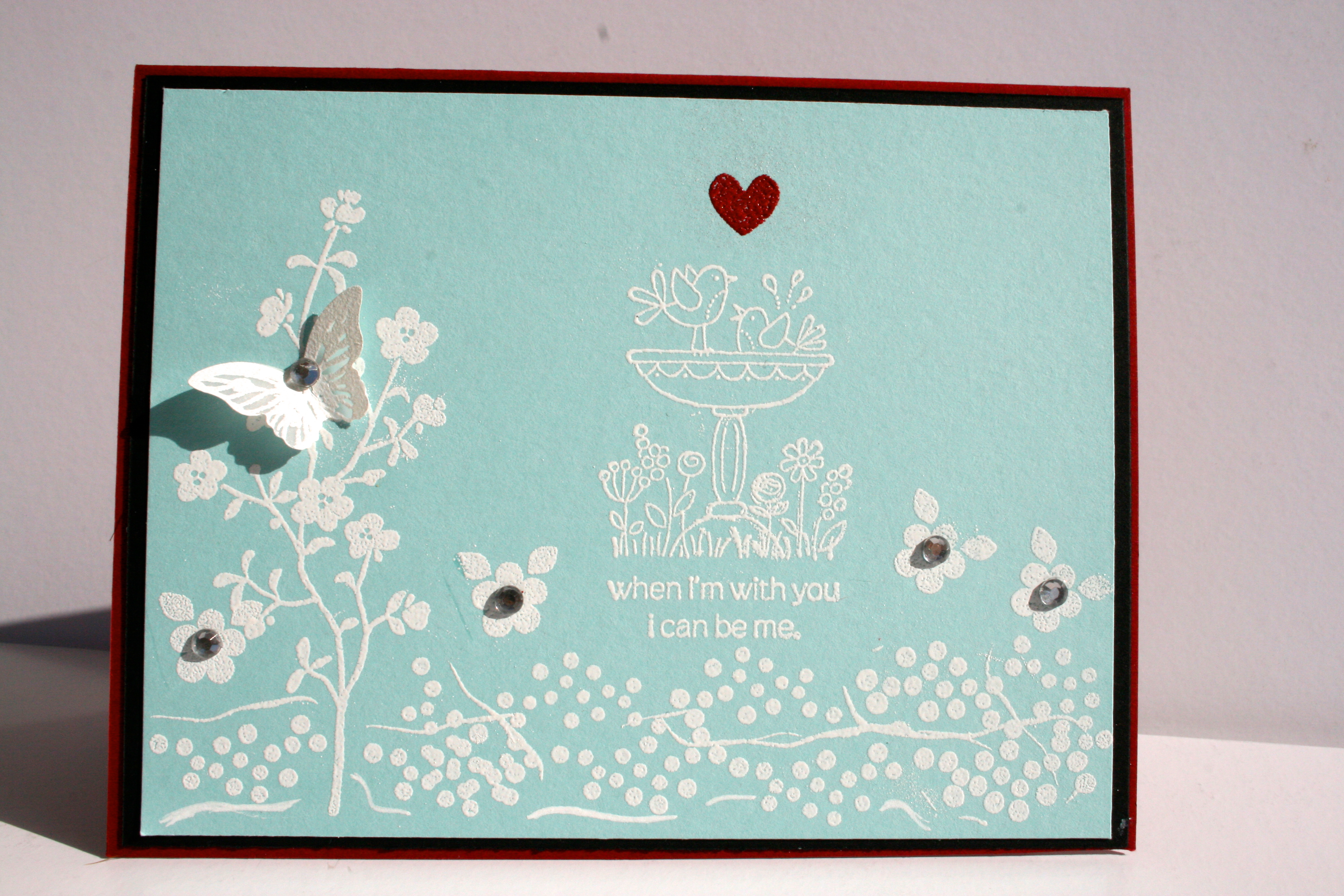 I used Cherry Cobler Embossing Powder (Item No. 122949) to emboss the little heart (the heart is from Create a Cupcake stamp set – Item No. 121982). I wanted a winter theme for my card and kept the colors to a minimum. As you all may know by now, I am not a huge fan of busy colors and so I always try to keep my color scheme very simple.