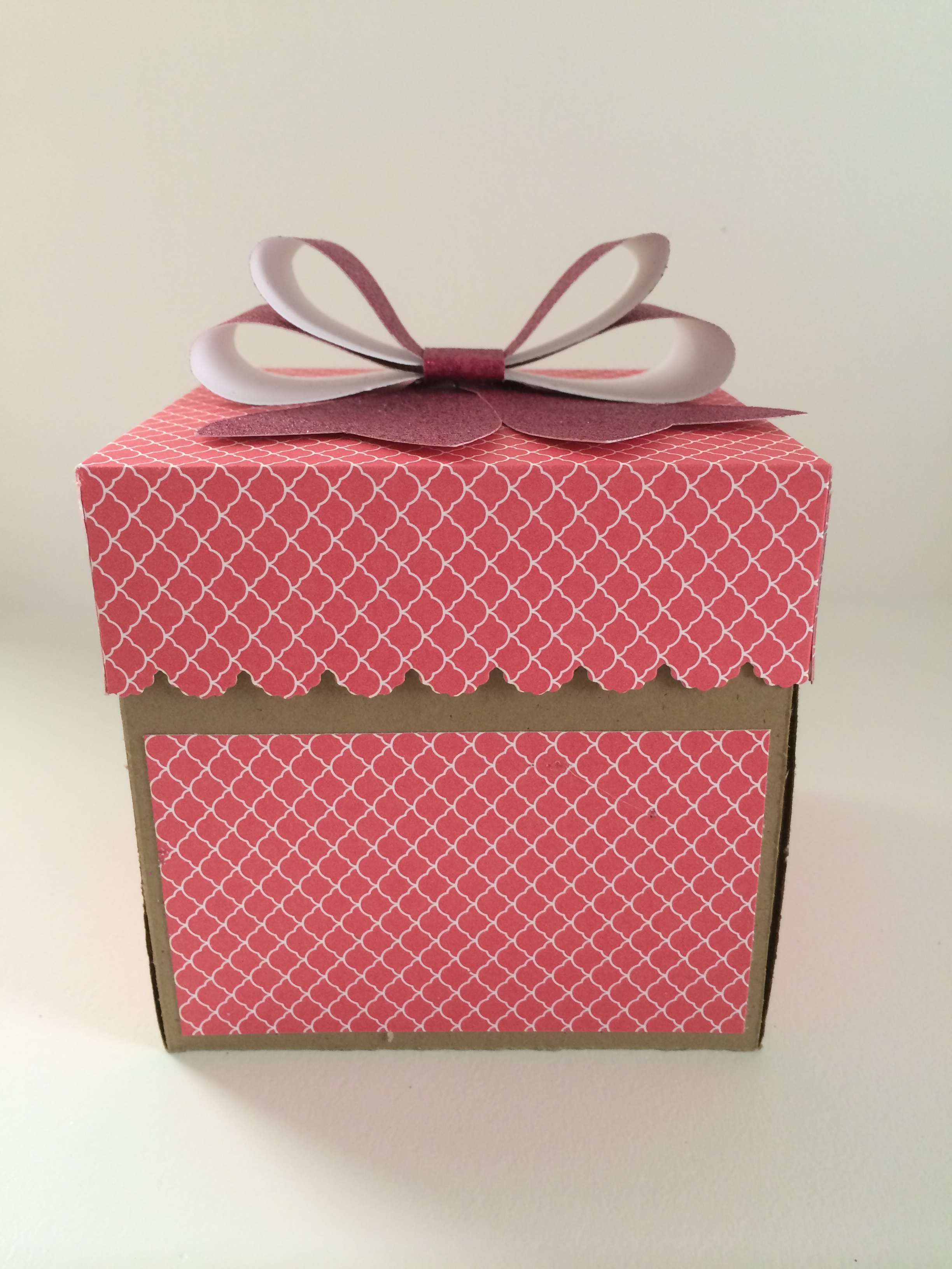 I made the bow using my Bigz L Bow Die from Stampin Up, adhering it on the lid of the box using hot glue.