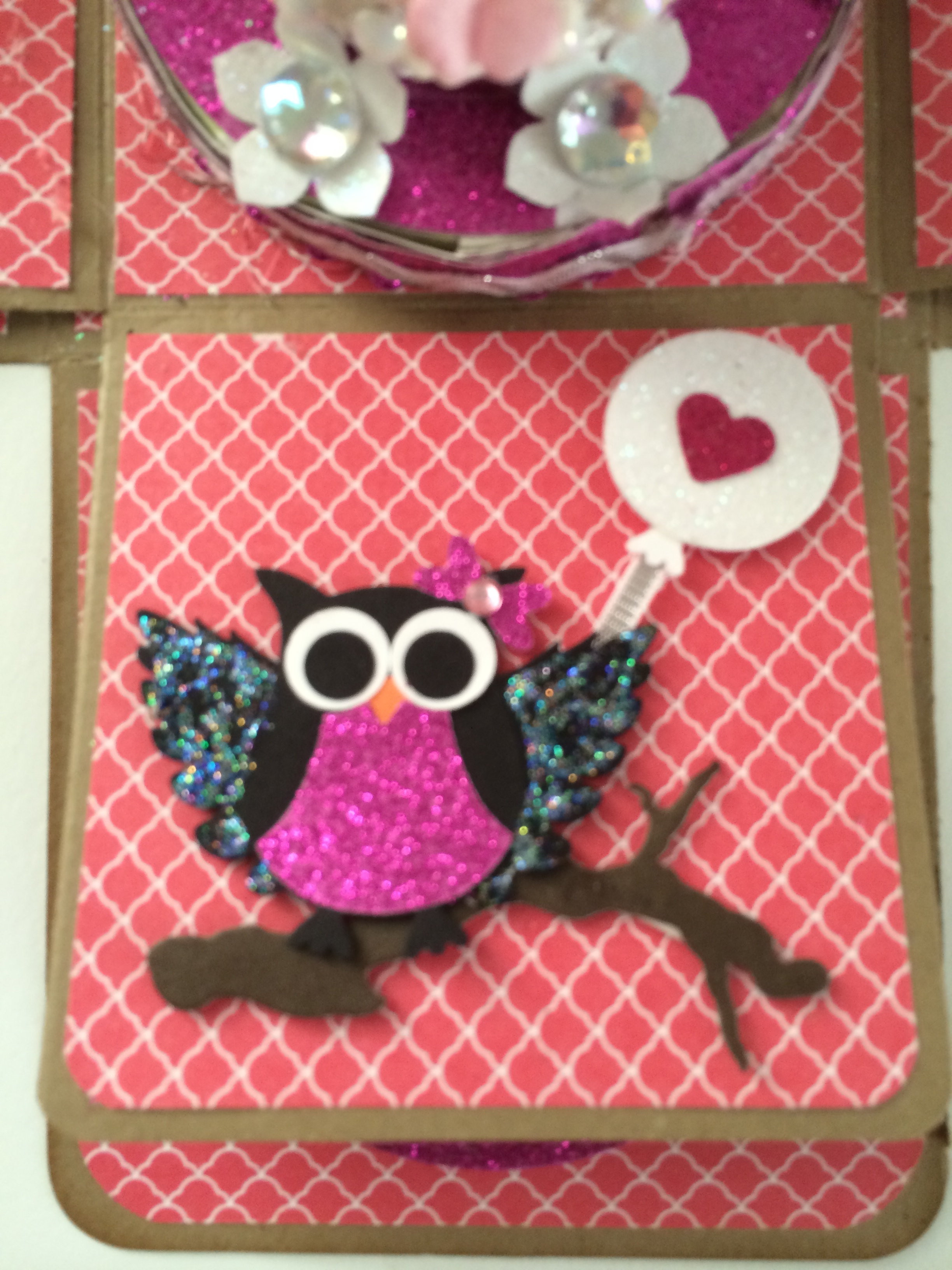 I created the balloons using my 1 3/8 circle punch and my Owl builder punch from Stampin Up. I also used the 1/8 silver ribbon from Stampin Up to create the string for the balloons.