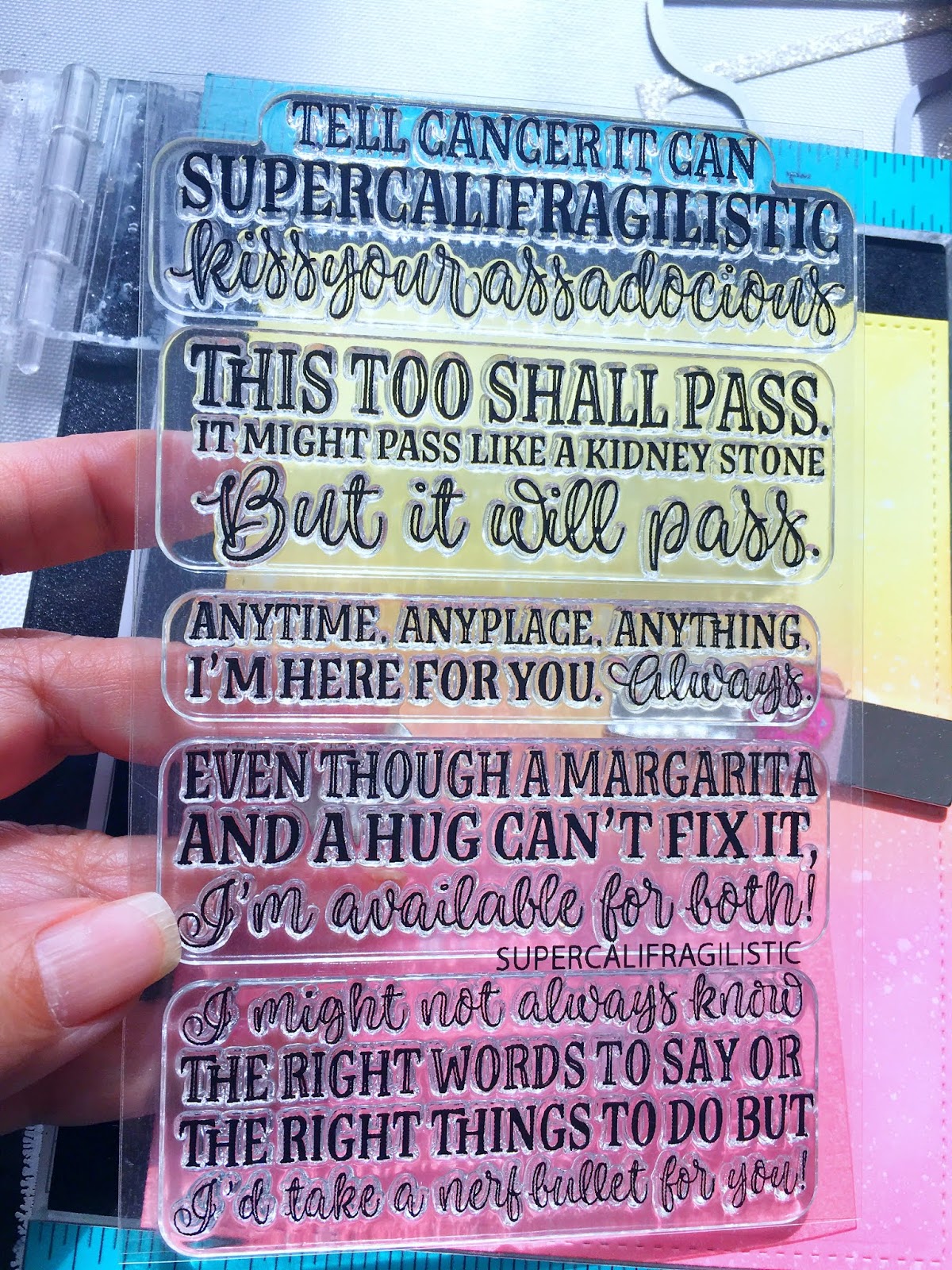 I don’t know about you but looking at this card makes me want to go out with my girlfriends and guzzle down some margaritas on the rocks, don’t you? The Supercalifragilistic stamp set is a must-have for any stamper! Here’s another look: