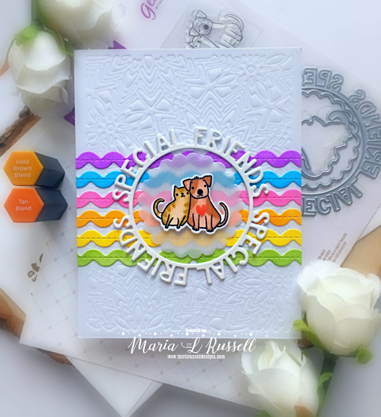 I adhered the Special Friends circle die-cut and the vellum scallop on my card with some liquid adhesives. Lastly, I adhered the cat/dog image in the middle of the die-cut circle with some foam adhesive for added dimension. Here’s my card:
