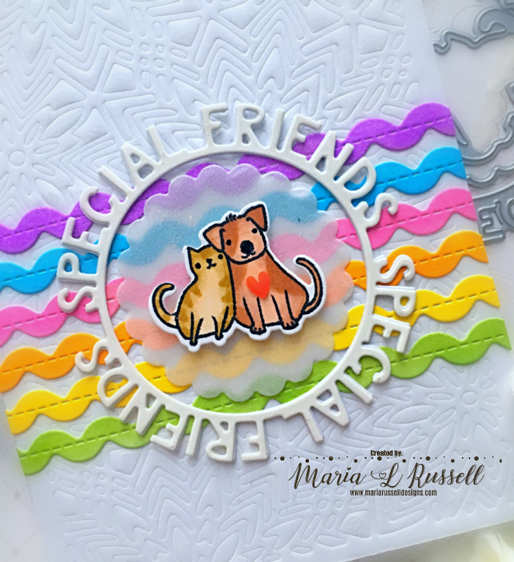 Using a backdrop die from my stash, I dry-embossed another piece of white card stock and adhered this on an A2-size white card base. I also die-cut the “special friends” circle using the Crafter’s Companion Special Friends stamp and die set. I also used vellum to die-cut the scallop piece.