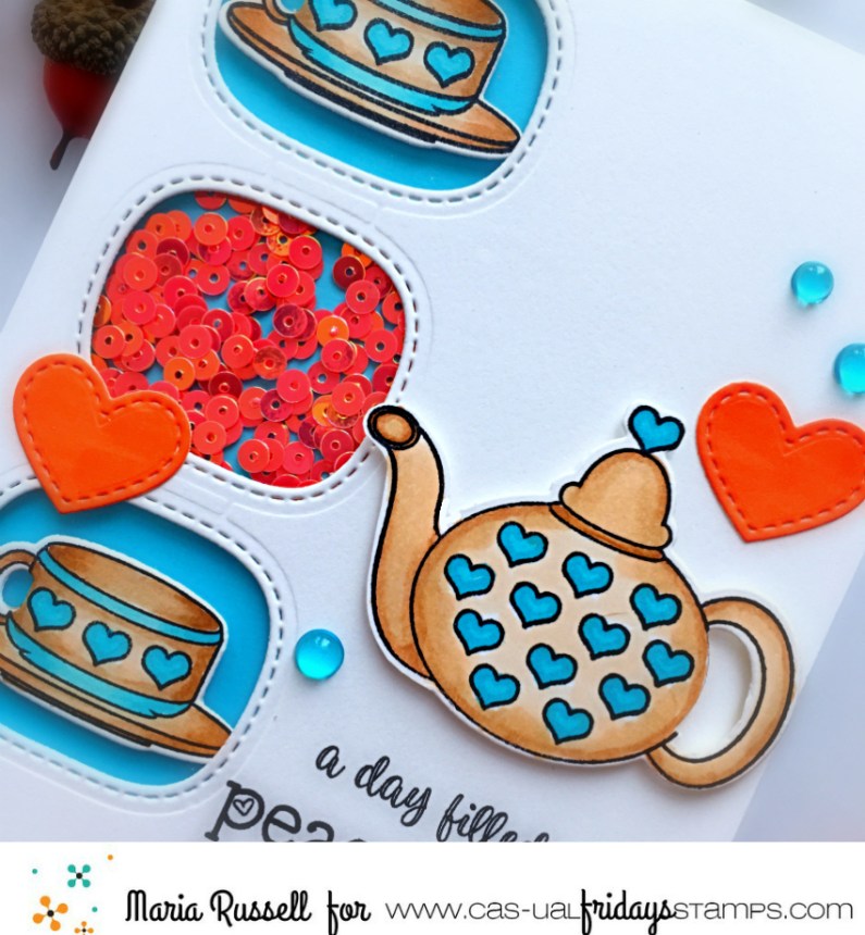I cut another A2 size Neenah white card stock and used a die from my stash to cut the three windows. I wanted to add some fun shaker elements to this card. I die-cut an A2 size acetate sheet and adhered in onto the back of the card. I added some orange sequins and foam mounted this on some blue card base. I also foam-mounted the coffee cups and the tea pot on the foreground. Here’s what it looks like: