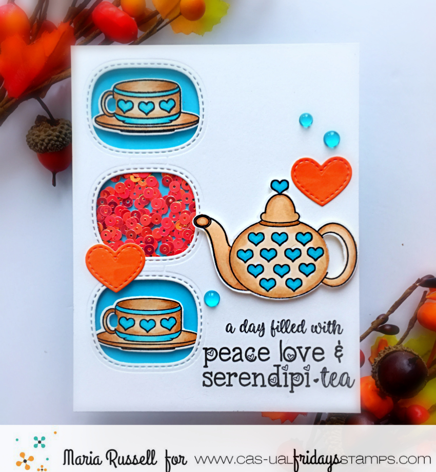 I cut another A2 size Neenah white card stock and used a die from my stash to cut the three windows. I wanted to add some fun shaker elements to this card. I die-cut an A2 size acetate sheet and adhered in onto the back of the card. I added some orange sequins and foam mounted this on some blue card base. I also foam-mounted the coffee cups and the tea pot on the foreground. Here’s what it looks like: