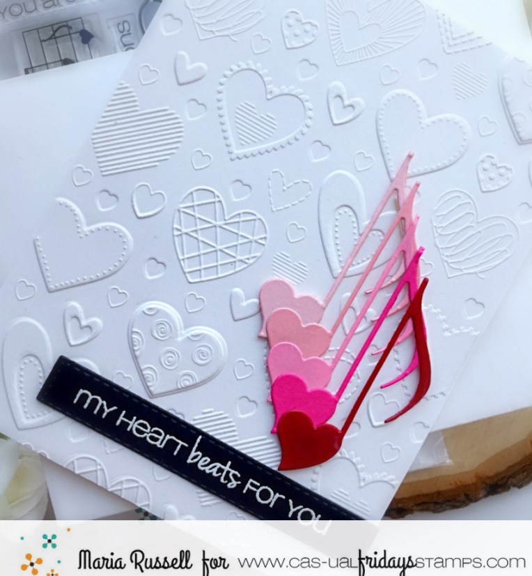 I die-cut the Heart Note Fri-Die in different shades of pink and red (should I call this color fifty shades of pink?  haha!).  I adhered and layered the heart notes together using liquid glue.   I foam-mounted this piece on my embossed background.