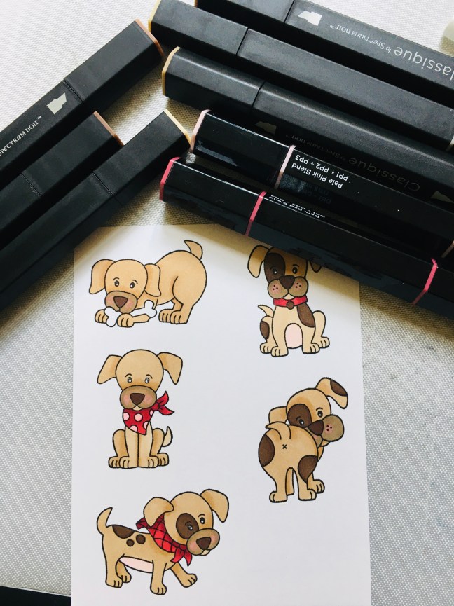 To begin, I stamped the puppy images on some Neenah solar white card stock and colored them in using my Spectrum Noir Classique and TriBlend markers.  I used the coordinating dies to die-cut the images.