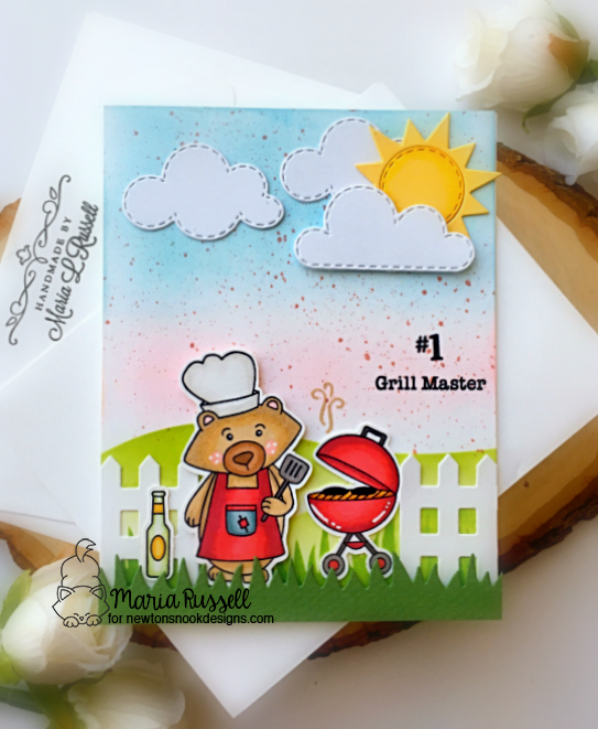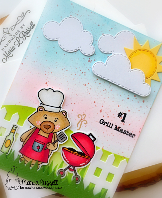 I finished my design by stamping the “smoke” using Desert Sand Memento ink and the #1 Grill Master sentiment with Versafine Onyx Black ink. I also added some glossy accents to the beer bottle for added texture and dimension. Here’s a closer look: