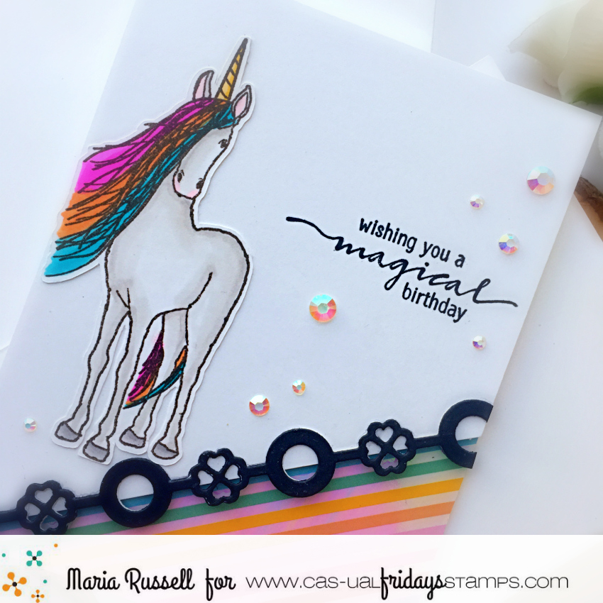 I hope everyone’s doing well! I’m sharing a simple birthday card today showcasing the Be a Unicorn stamp set with the Unicorn Fri-Die.