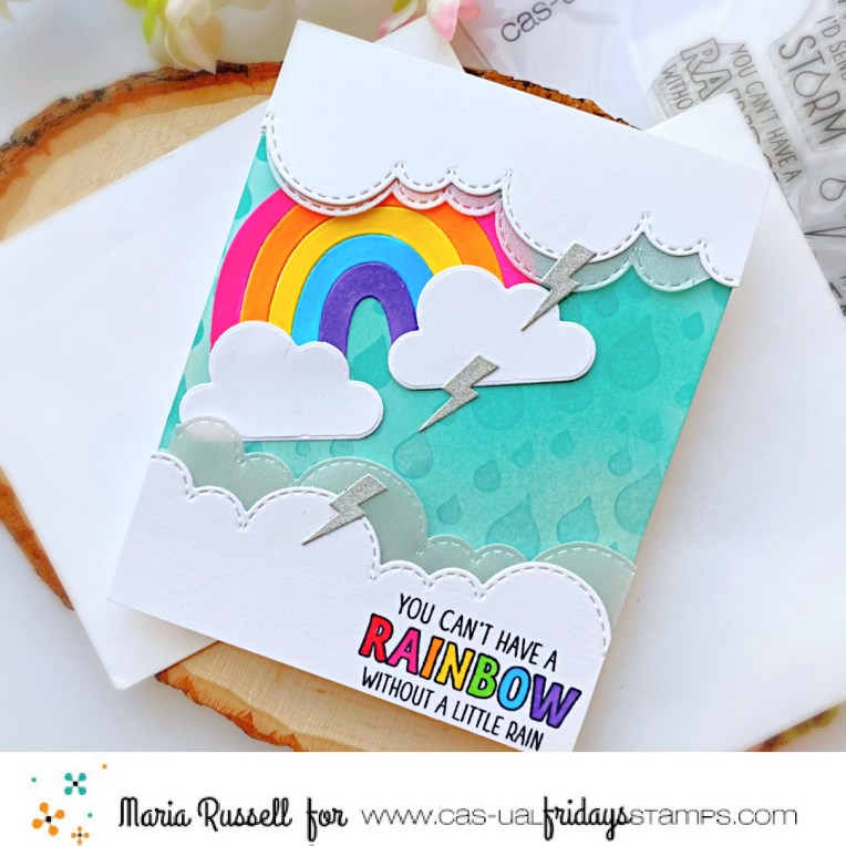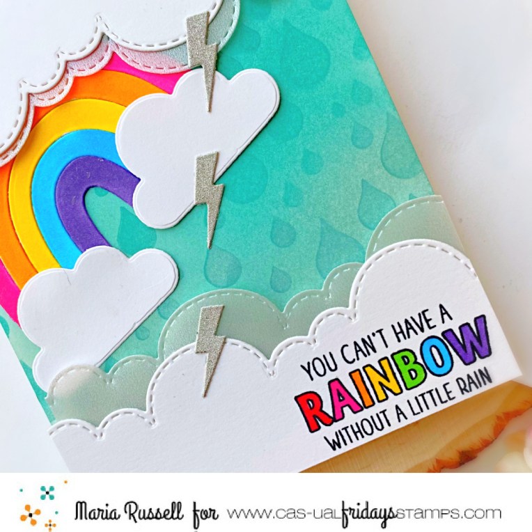 The smaller clouds and lightning die-cuts were cut using the dies from the Raindrops Duo stamp & die set. I also die-cut the bigger clouds and rainbows using dies from my collection and adhered on the focal panel with liquid and foam adhesives.
