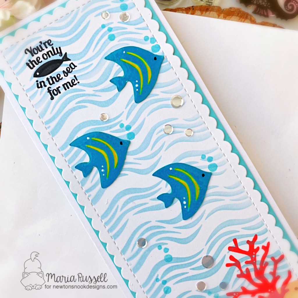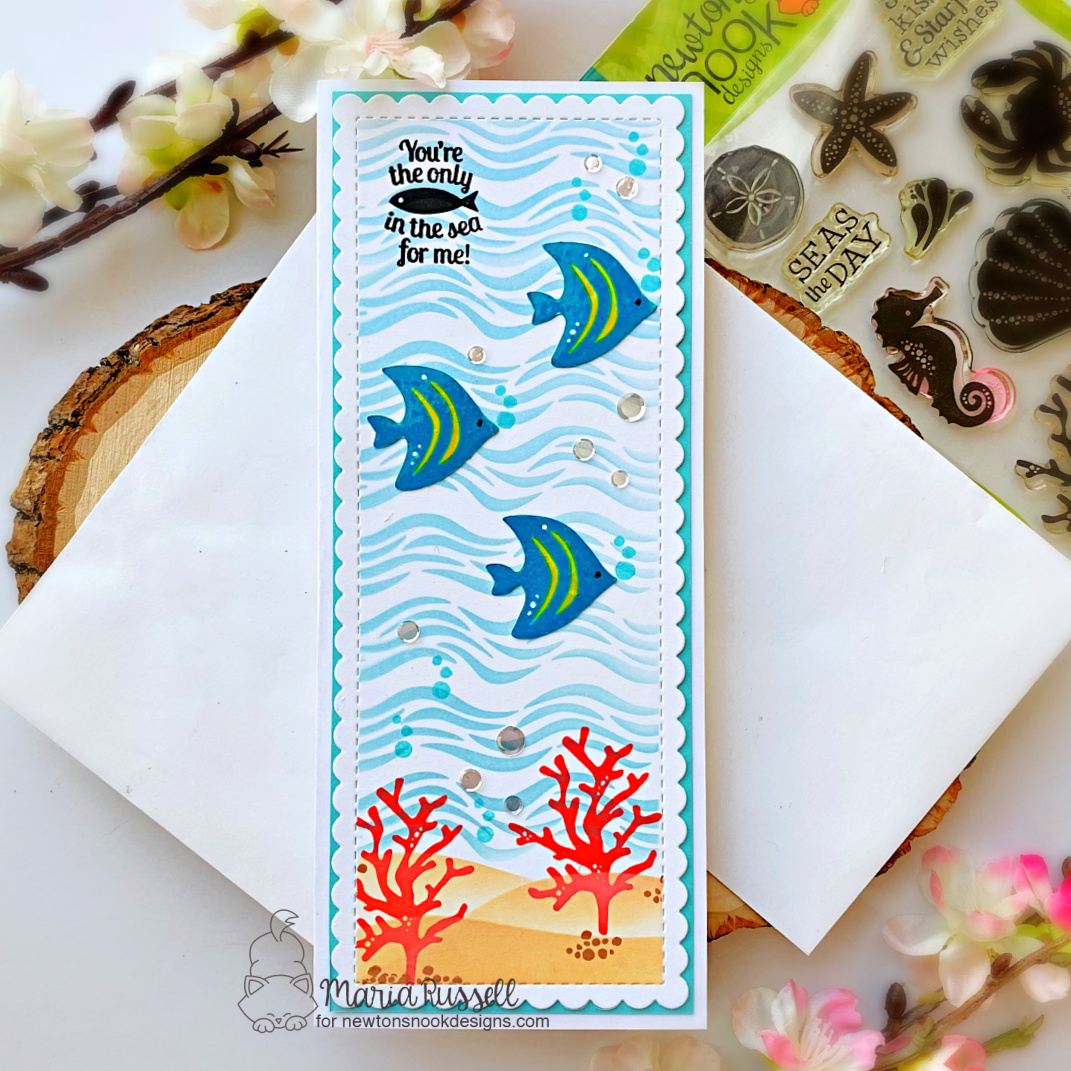 Hello Newton’s Nook fans! I have a slimline card for you today showcasing the Tranquil Tides stamp set, along with the Slimline Frames & Portholes die with the Waves and Hills Stencil.