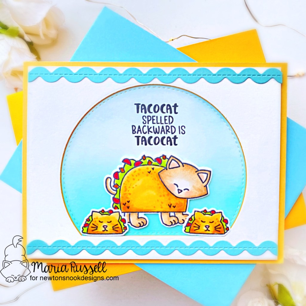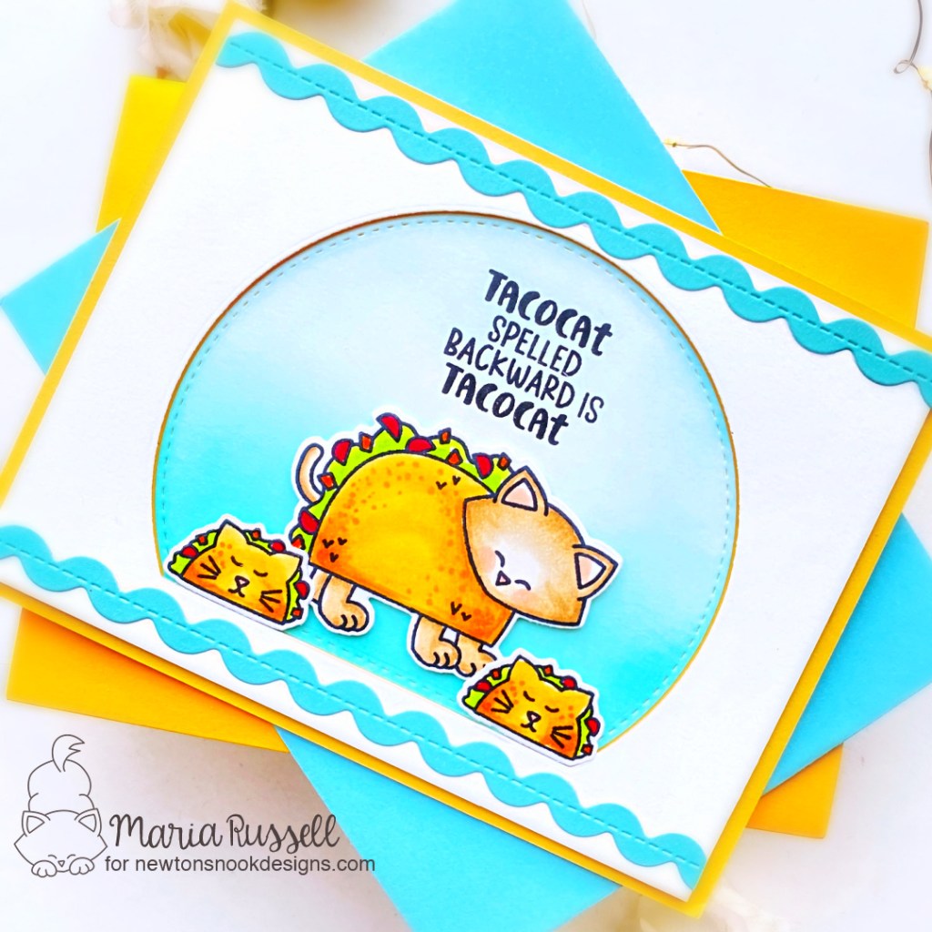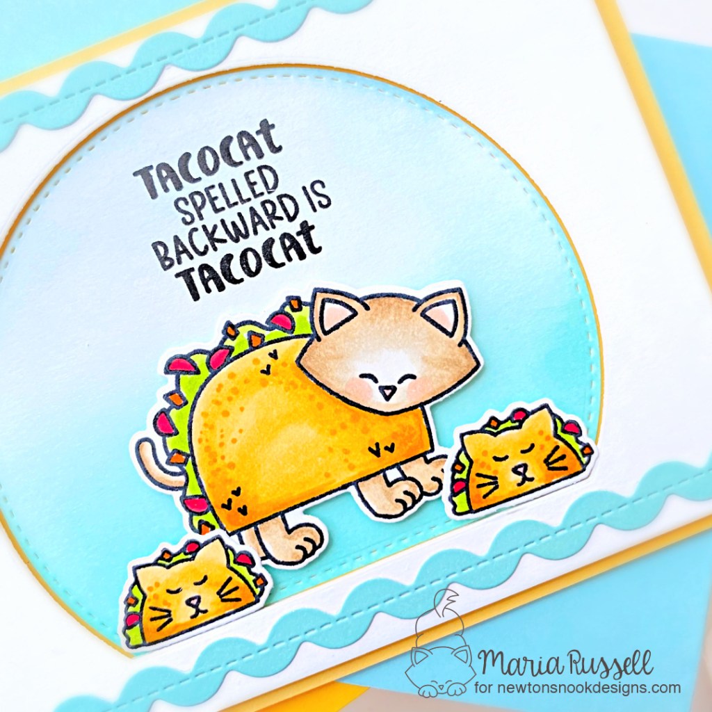 Love the blue ink blending & die cut window behind the taco Newton! Your ric-rac borders & the cat shaped tacos are just too cute!