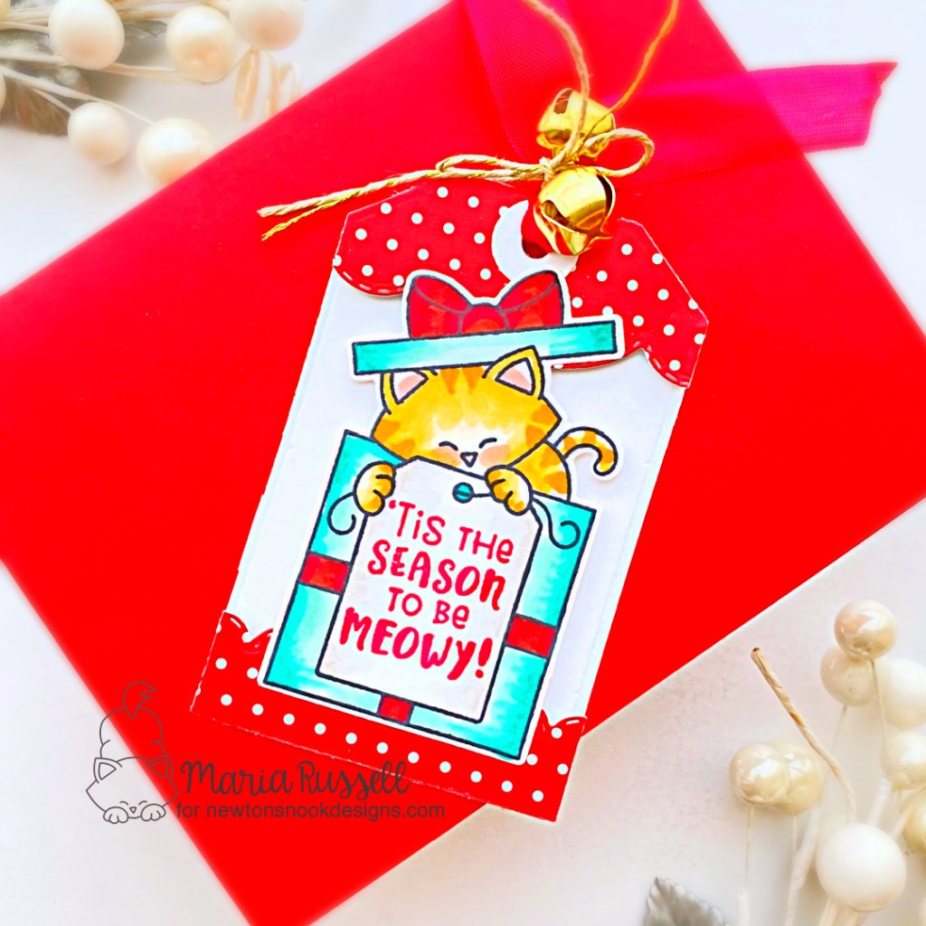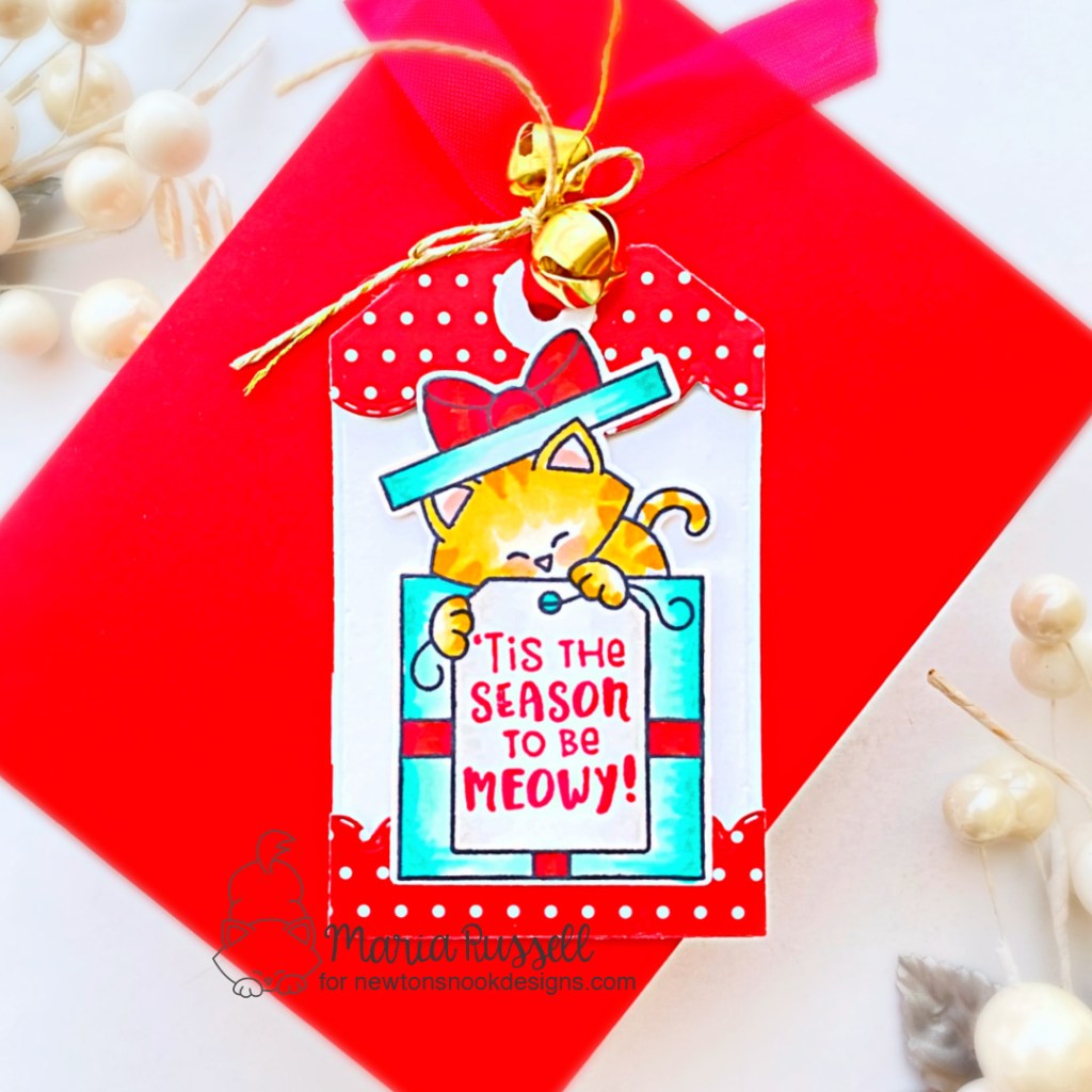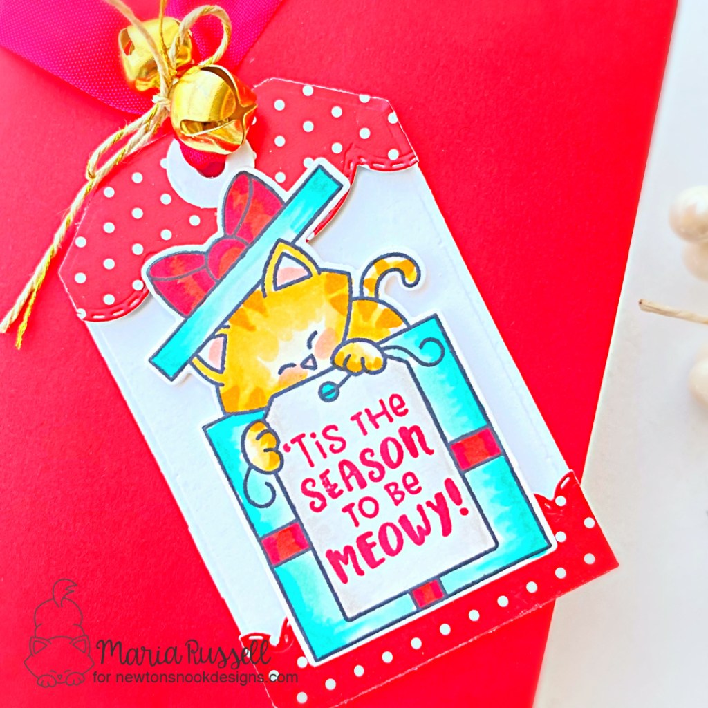 I finished the tag by adding some red ribbon and gold jingle bell, then stamped the sentiment with some red dye ink. Here’s another look: