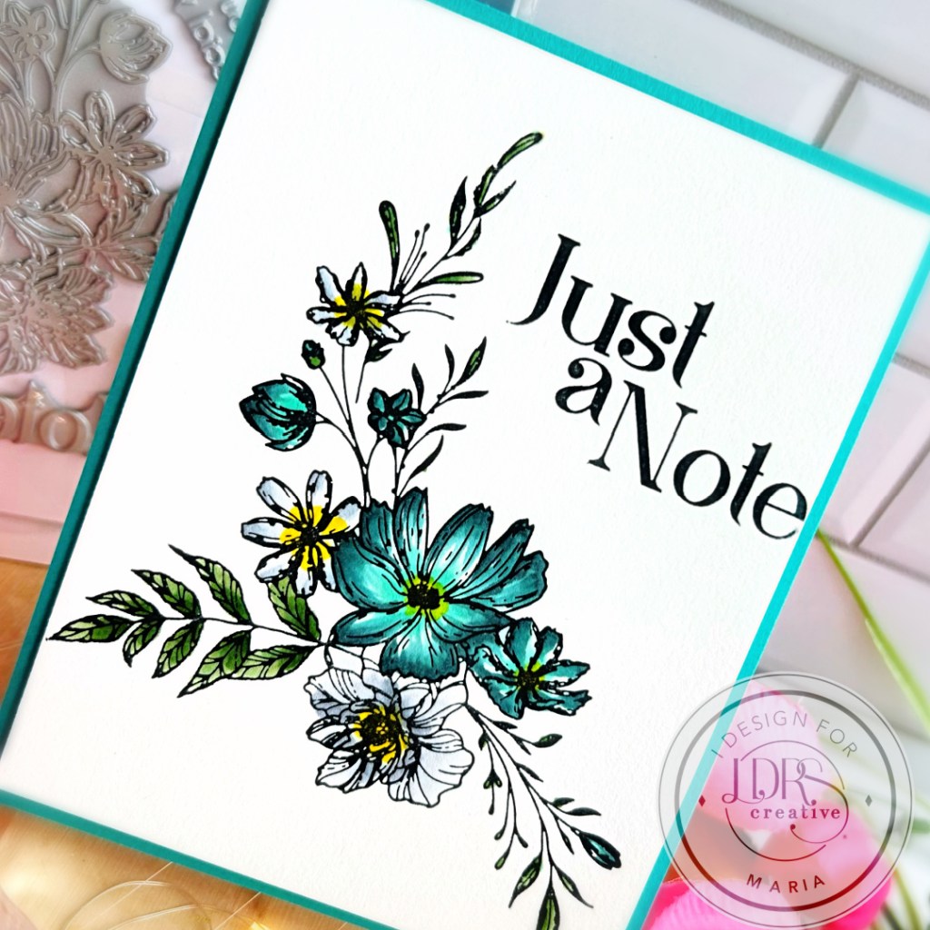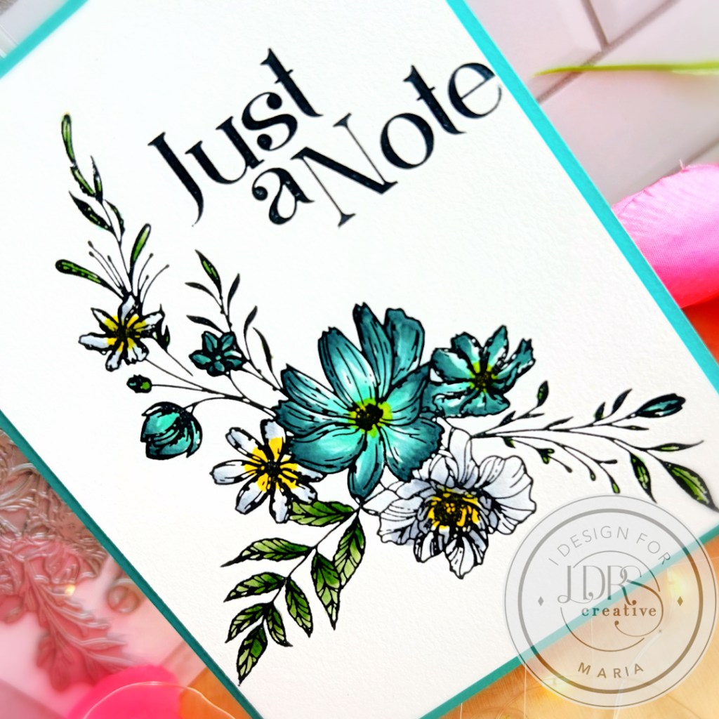 I used my BetterPress Letterpress Platform and pressed the floral and “Just a Note” from the Breezy Blossoms Impress-ion Press + Foil Plates onto some white card stock measuring 4 x 5/14 inches with Raven Hybrid ink. I colored the images using some alcohol markers. Sometimes, I always lean towards pinks and greens so for some inspiration, I followed the colors from the photo sample at the back of the packaging.