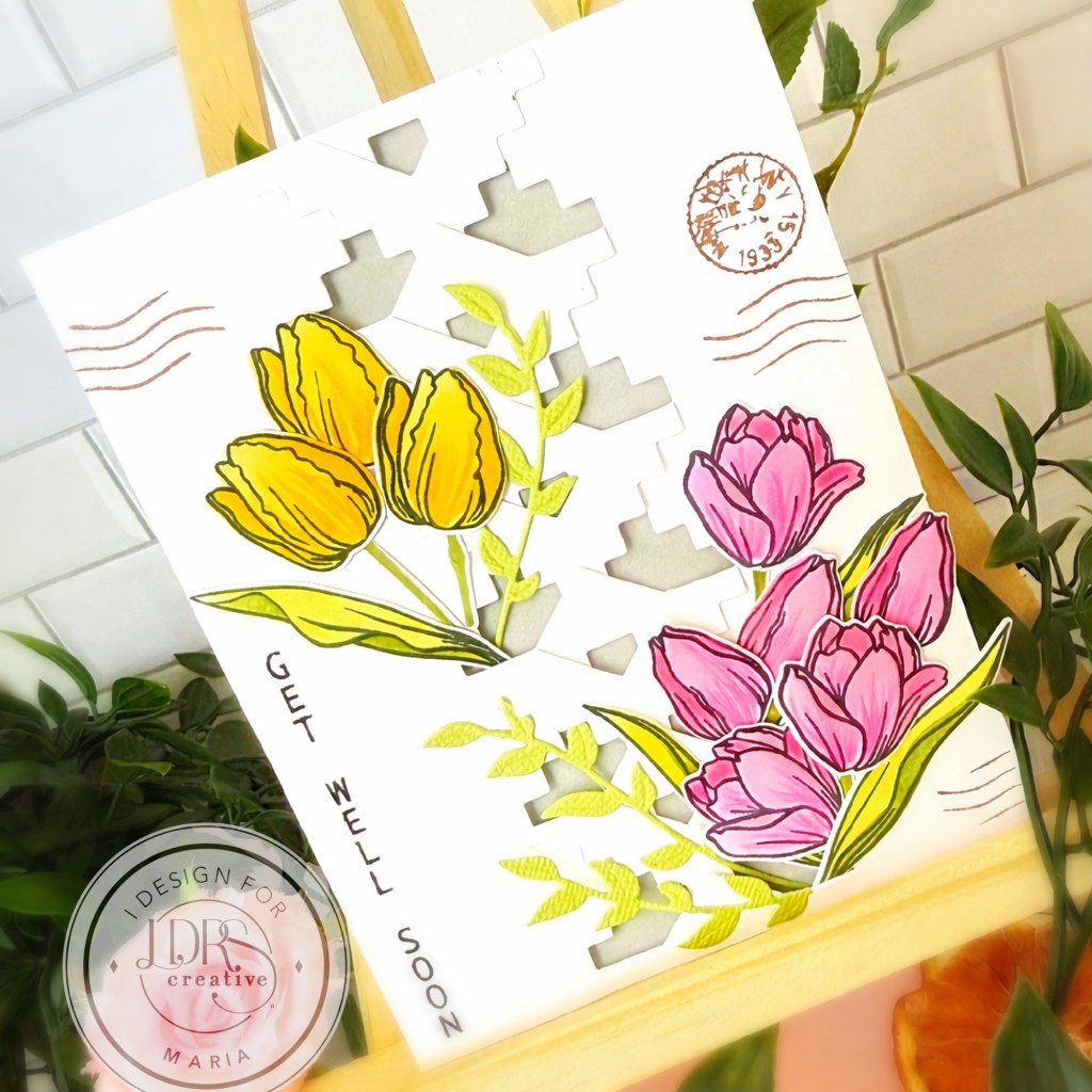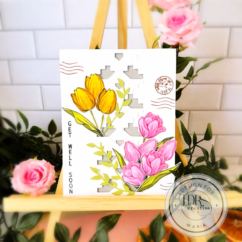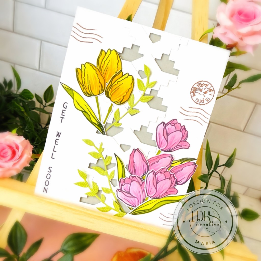 To make the images pop, I used colored pencils to add more detail and dimension to the flowers, and used the Fresh Cut Tulips Coordinating Dies to cut them out.