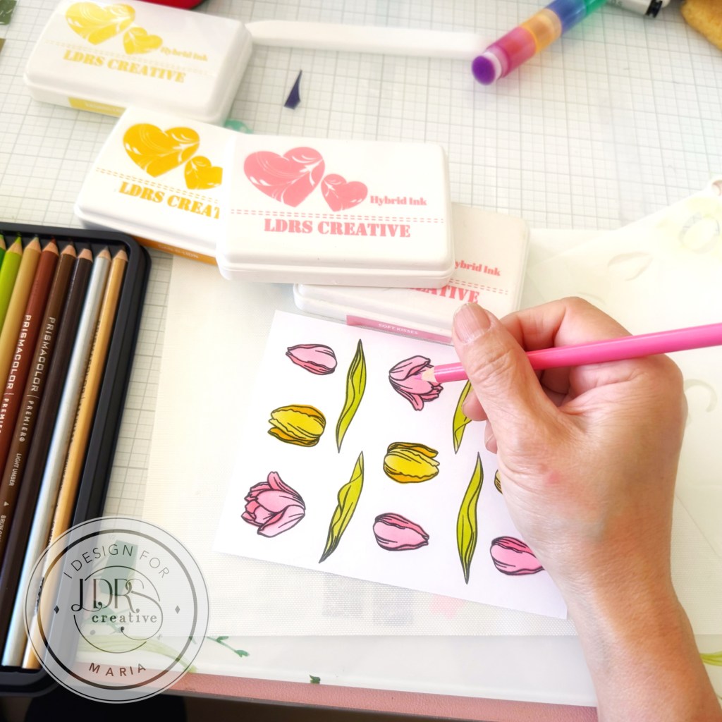 I started by stamping the images on white cardstock with Raven Hybrid Ink.  I used the Fresh Cut Tulips Layering Stencils to add color to the tulips.  It really made a HUGE difference to have the layering stencils to color the images.  For reference, I used Pink Tutu, Soft Kisses, Banana Cream Pie, Dan-D-Lion, Key Lime Pie, and Olive Branch Hybrid Inks.  I absolutely love the combination of these colors!