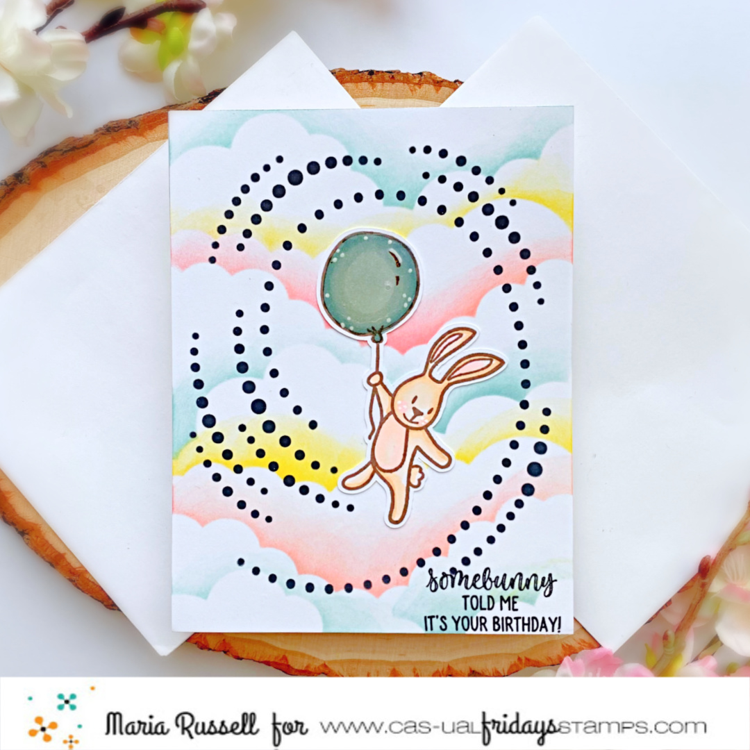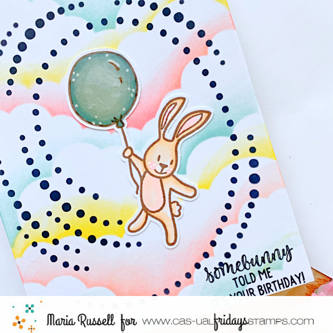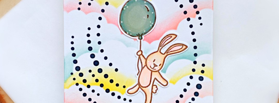 To make my card, I used a clouds stencil from my collection to ink up some Bristol Smooth white card stock using Worn Lipstick, Mustard Seed and Speckled Egg distress oxide inks. I stamped my image from the Somebunny Stamp set and used my precision snips to fussy-cut the image. I used glossy accents for added texture to the balloon. I set this aside to dry for about half an hour.