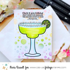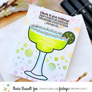 This is simple, really! I started by stamping the margarita glass on some Neenah solar white card stock with Spectrum Noir Finesse ink in Black. I colored the image in with Spectrum Noir Classique markers. I added the “bubbles” using the Bubbly Stencil with some dye inks and blending brushes.