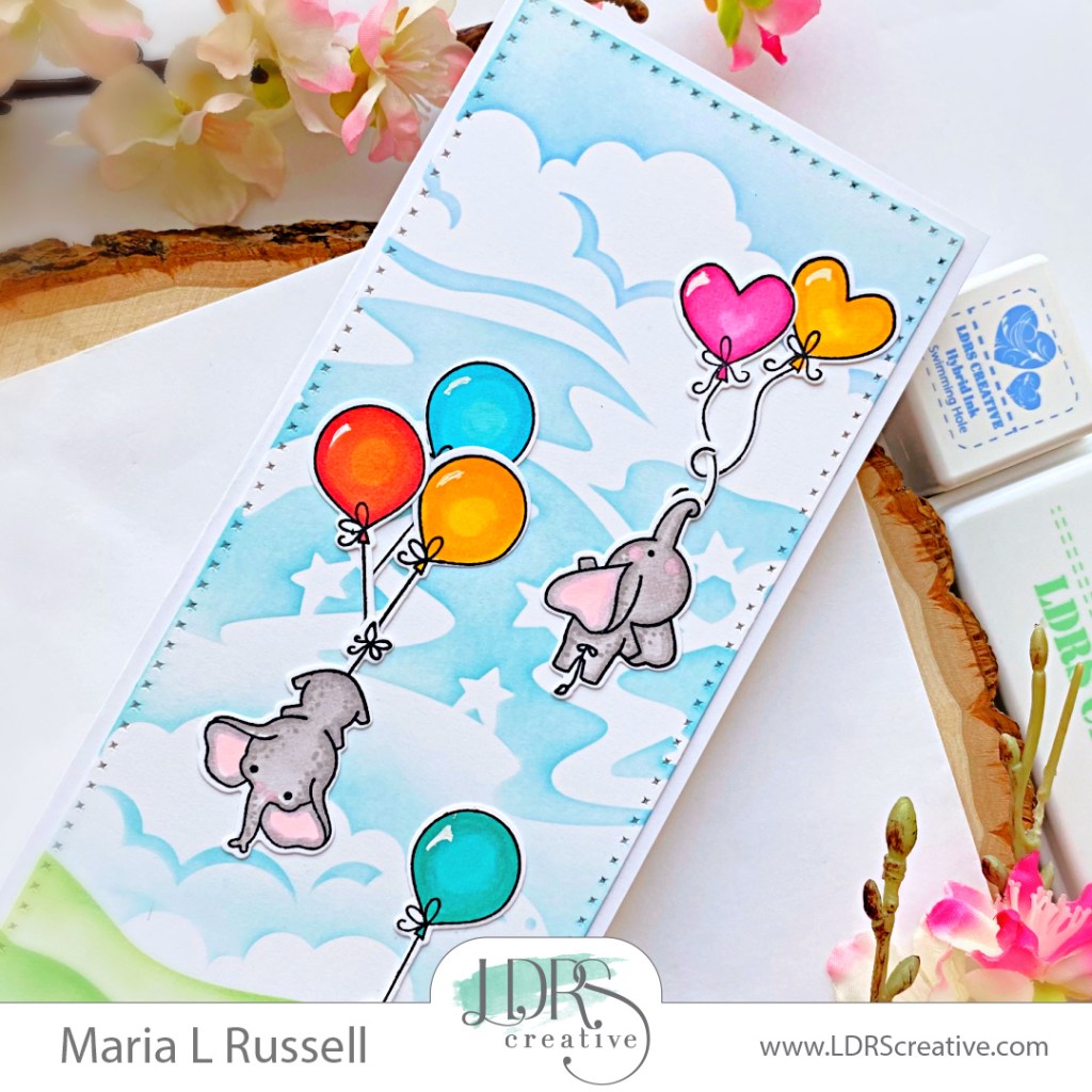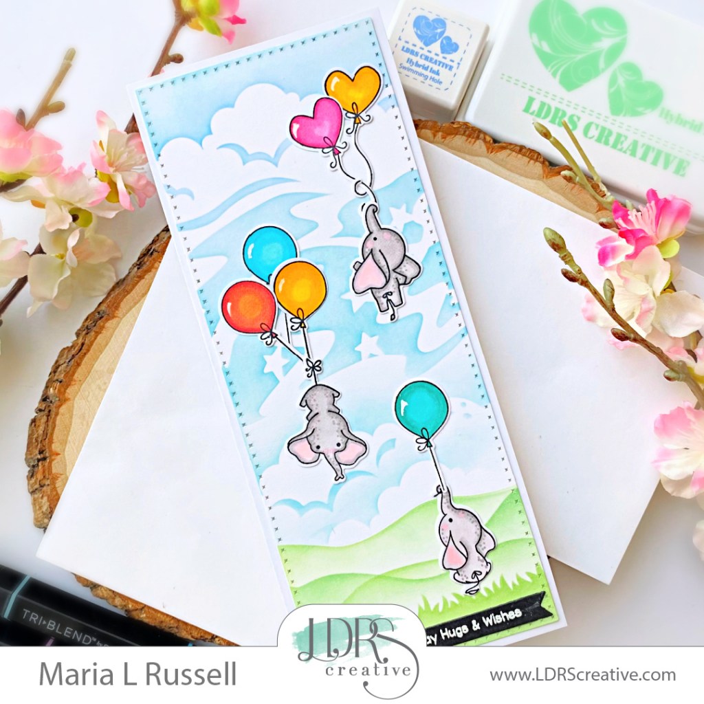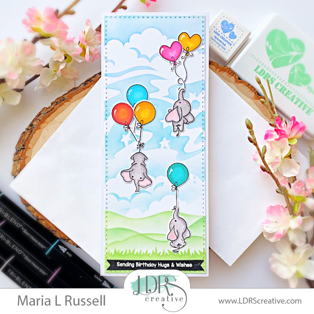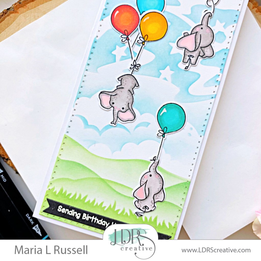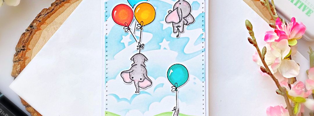 I love the colorful balloons and the cute little elephants flying up, up & away! The magical sky just added that whimsical touch to the overall card design.