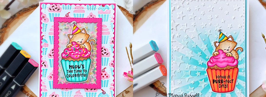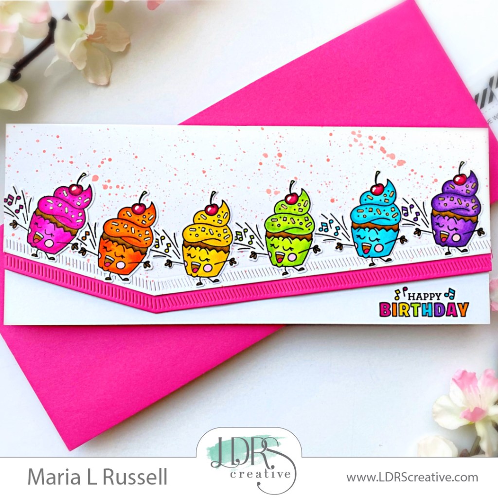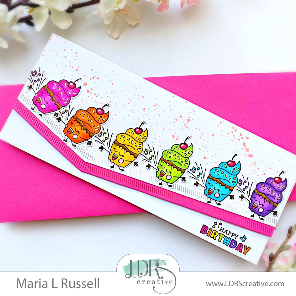 I adhered the pink frame on the white card panel and foam-mounted both on a slimline card base for added dimension. I then lined up the images and evenly spaced them while adhering one-by-one with liquid glue. I finished my design by stamping the sentiment with Raven Hybrid Ink and coloring the letters using the same color of markers that I used for the cupcakes. I also used some gold gel pen for the sprinkles!