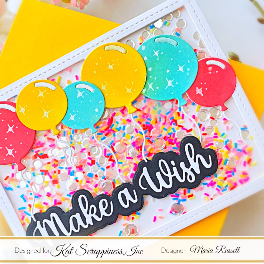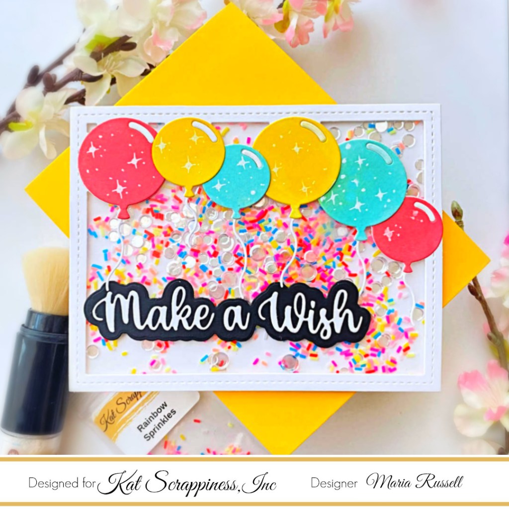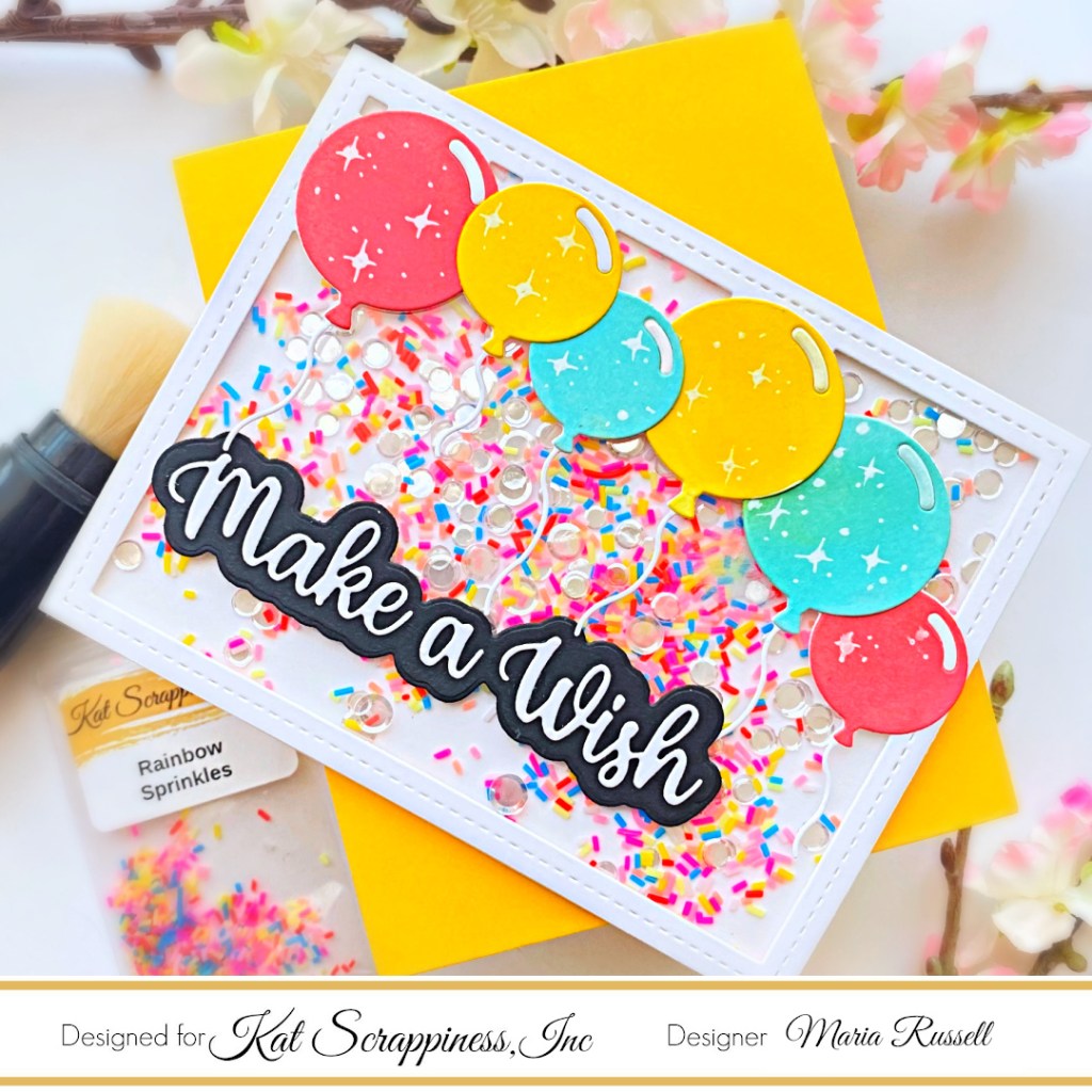 I adhere the balloons with liquid glue and created a shaker well, by adding acetate sheet to the back of the die-cut panel and foam adhesive. I used the rainbow sprinkles as my shaker element and adhered the panel on some A2 size notecard.