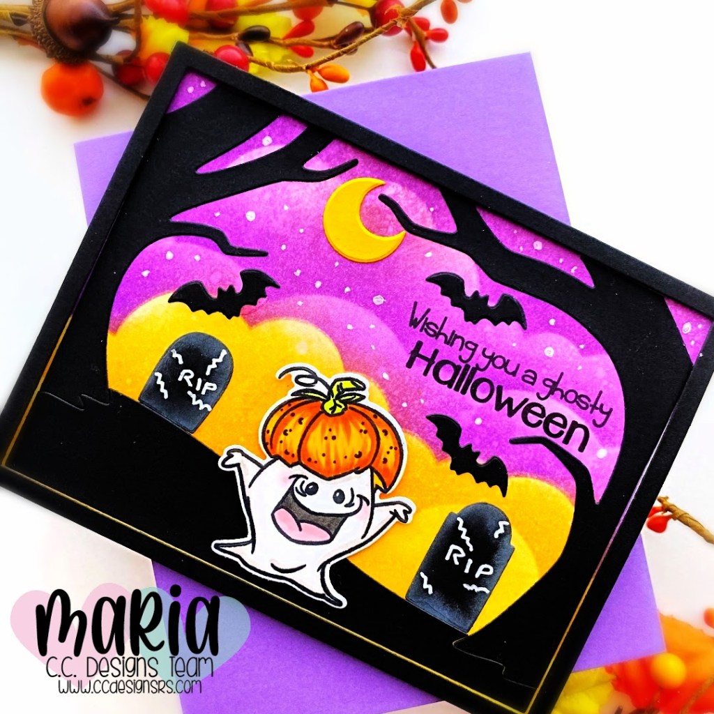 Hello my crafty friends. I have another sneak peek for you of the September Release by CC Designs. For my card today, I am showcasing the Roberto Rascal’s Ghosts Stamp Set and Coordinating Dies.