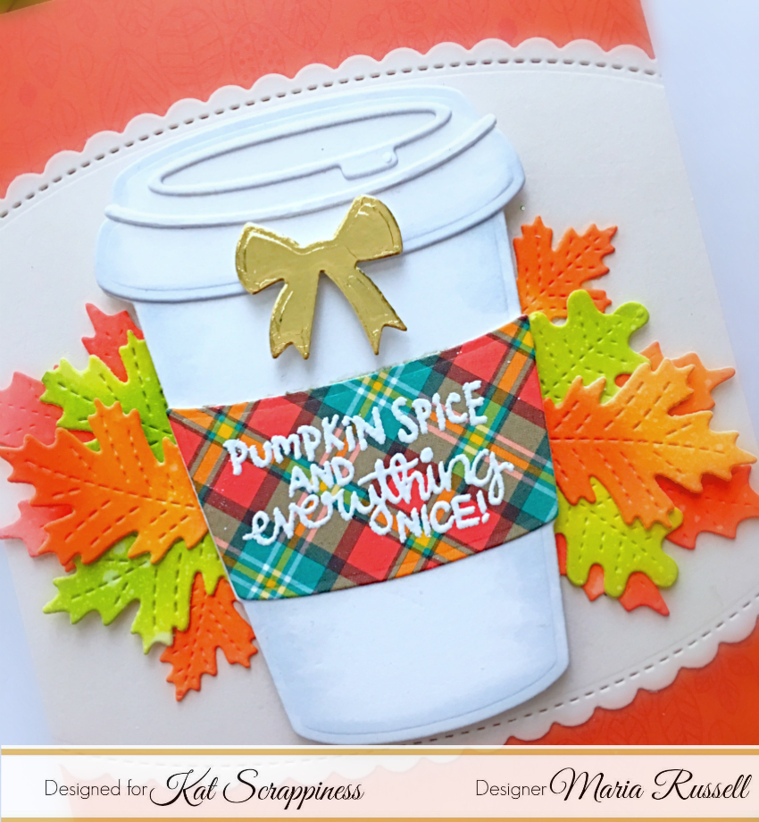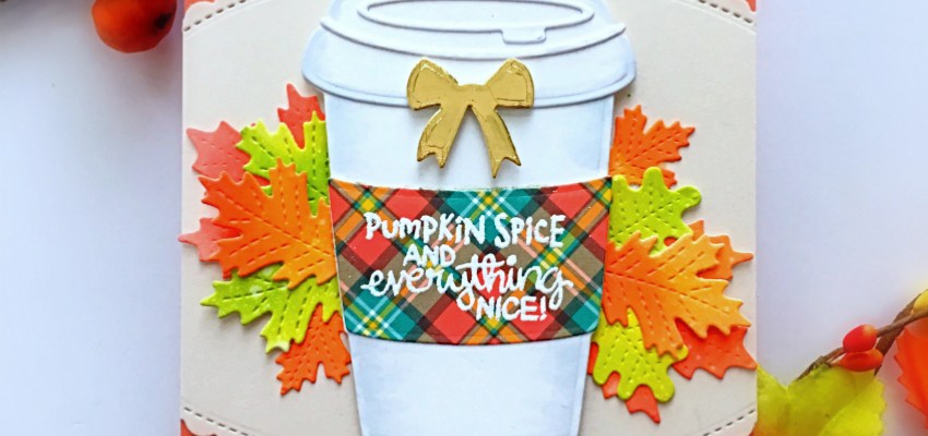 I added some patterned paper on an A2 size card base and adhered the inked background. I finished my design by adding a few leaves from the Happy Fall Y’all stamp set. Here’s another look:
