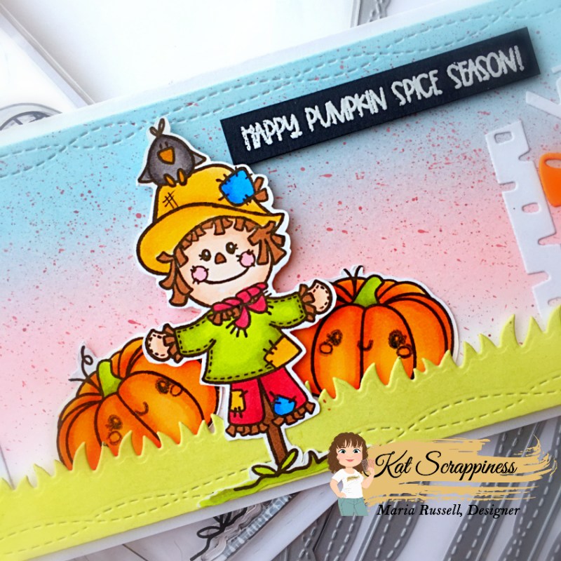 The images were stamped and colored with Spectrum Noir TriBlend markers and fussy-cut using precision snips. I adhered the images onto the background using liquid glue. I foam-mounted the scarecrow for added dimension. Here’s a closer look: