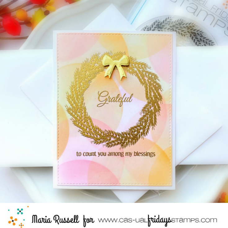 I went for a clean and simple design for my first card. The background was die-cut using the Wonky Stitched Nesting Slimline die on a panel of Bristol smooth white card stock and ink-blended with distress oxide inks. I wanted the colors to be very subtle to create an early morning autumn sky. I splattered some color on the background using aged mahogany distress oxide ink, mixed with water for added texture and dimension. I also die-cut the rest of the elements that I needed to create my scene.
