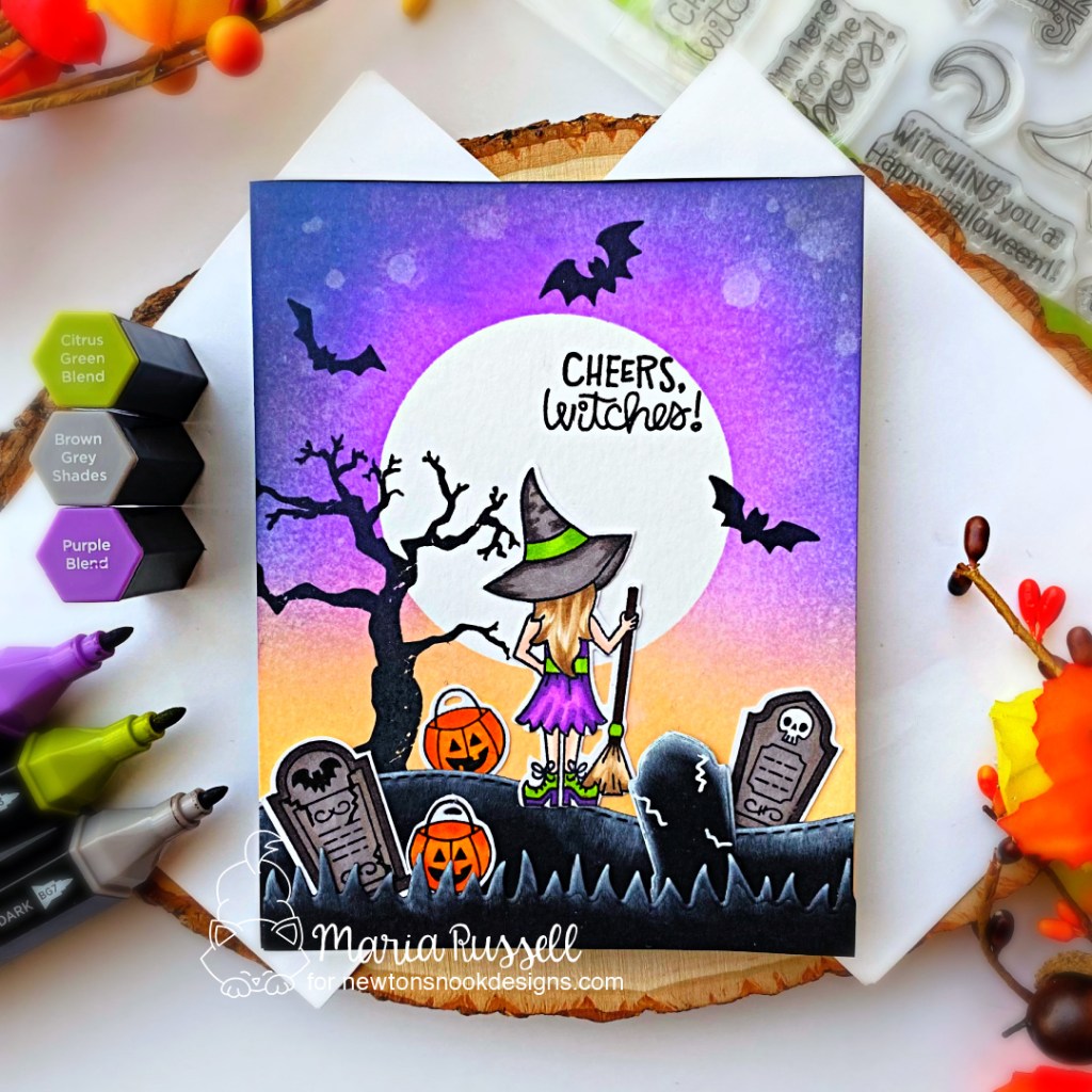 For my first project, I started by die-cutting the pattern paper from the Halloween Meows Paper Pad and adhered the same on some A2-size, top-folding notecard. I stamped the images on some Neenah solar white card stock and colored them in with alcohol markers. I used the coordinating die to cut the image out.