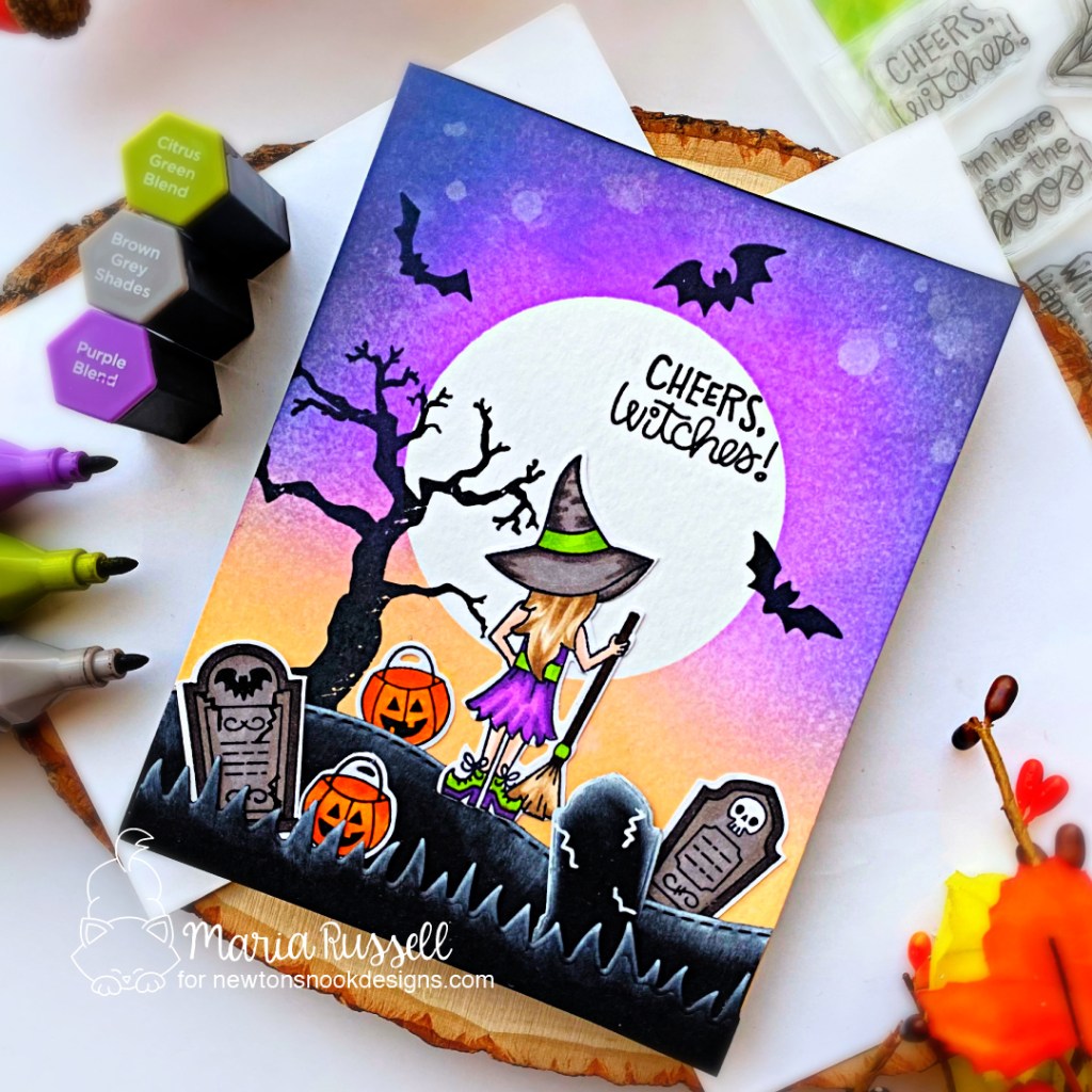 Die-cut the grass panel using the Land Border Die on some black card stock and adhere to the foreground with liquid glue. Adhere the focal image on the card. Stamp the bats with some black ink.