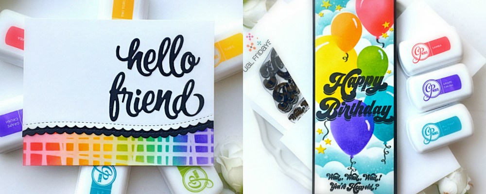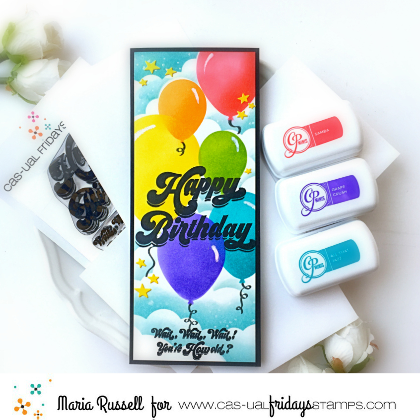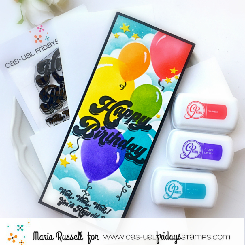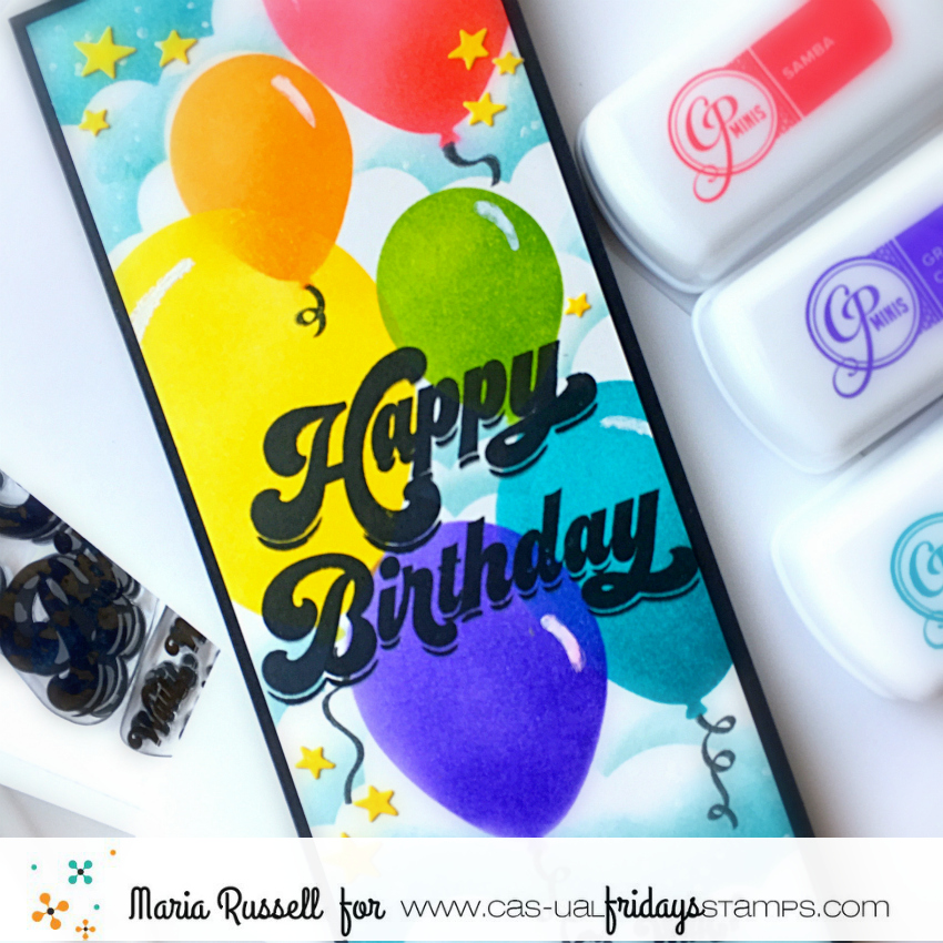 For this hop, I am showcasing the Happy Birthday stamp set and SweetFriend Fri-dies by Cas-ual Fridays, along with the AMAZING CP Minis – Carnivale Collection, CP Off The Loom Stencil, Oval Balloon Stencil, CP Minis – Life of the Party and CP mini ink in Midnight.
