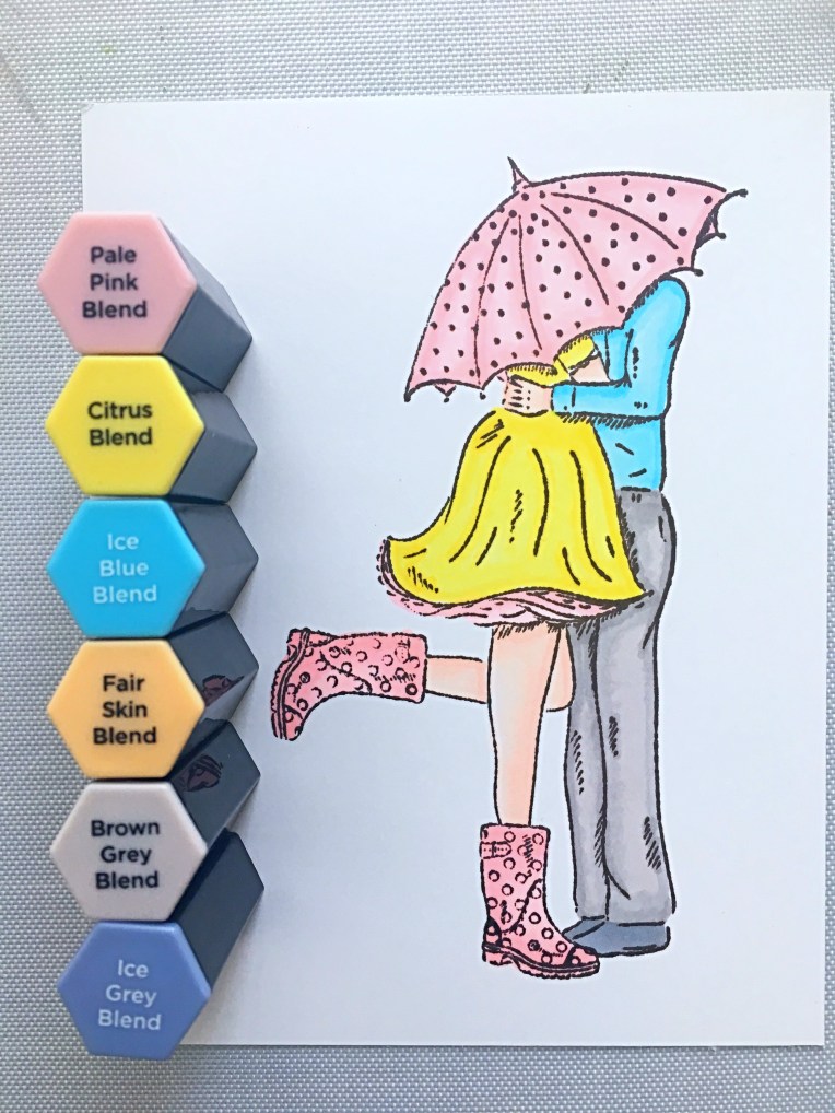 I started by stamping the image on some Spectrum Noir Ultra Smooth Premium White Card Stock with Finesse Alcohol Proof Dye ink in Rustic Brown.  I colored the image in with my Spectrum Noir TriBlend markers. The colors I used are shown in the photo below.