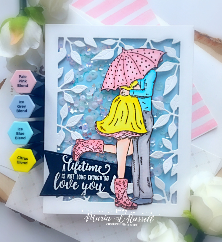 I stamped and colored my images on some Neenah solar white card stock and colored them in with my Spectrum Noir alcohol markers. I used the Sea Border and Sky Border dies to create more texture to my ink-blended panel.  I adhered this piece on an A2-size side-fold card base and adhered the images with liquid and foam adhesive.
