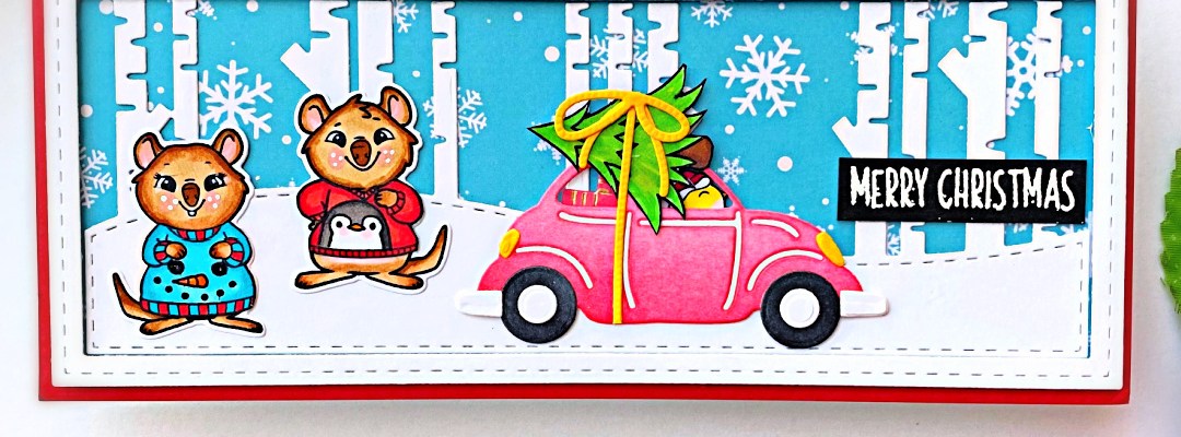 I went for a clean and simple design for my first card. The background was die-cut using the Wonky Stitched Nesting Slimline die on a panel of Bristol smooth white card stock and ink-blended with distress oxide inks. I wanted the colors to be very subtle to create an early morning autumn sky. I splattered some color on the background using aged mahogany distress oxide ink, mixed with water for added texture and dimension. I also die-cut the rest of the elements that I needed to create my scene.