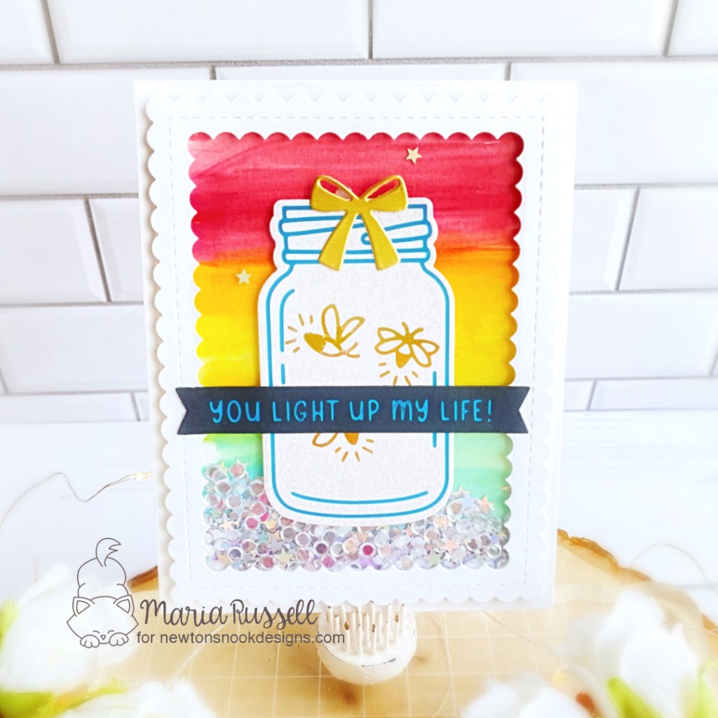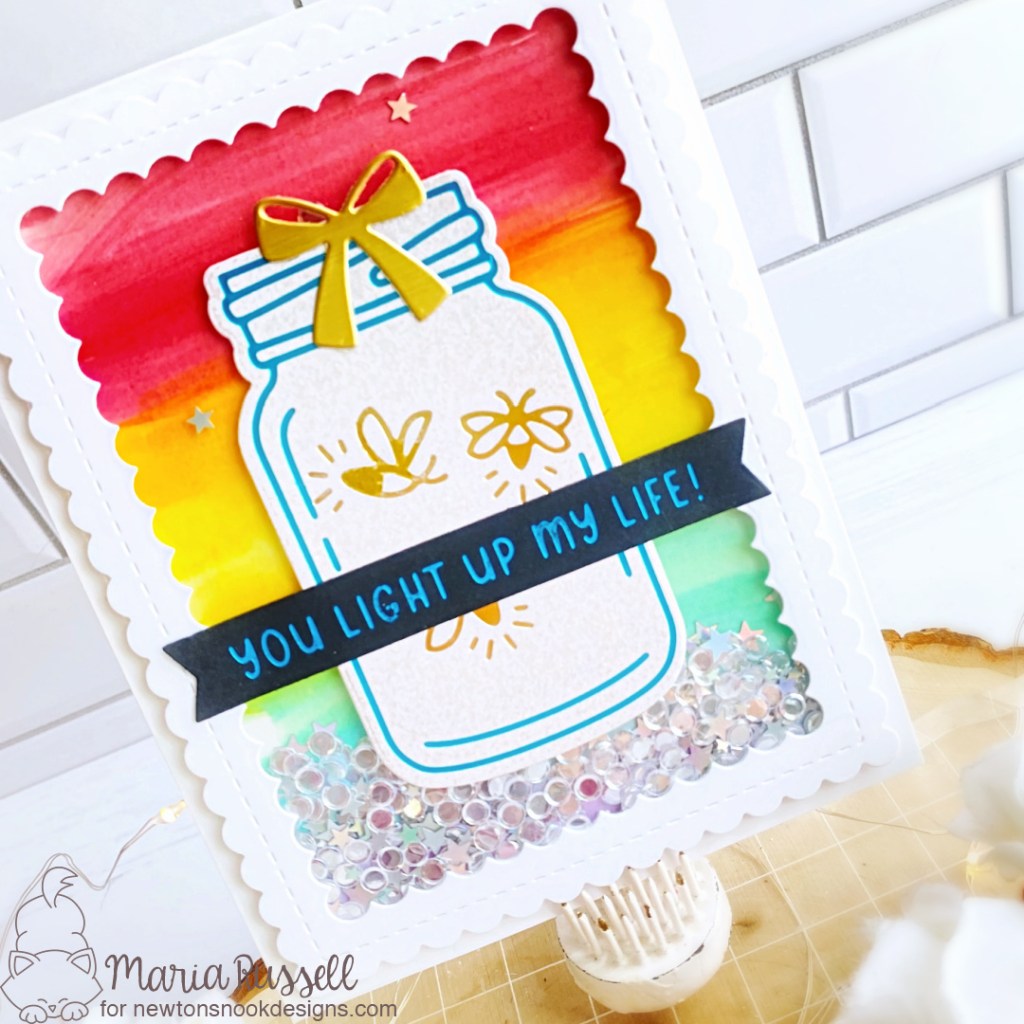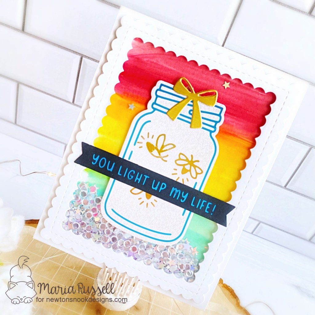 I also used the Fireflies Foil Plates with Therm-O-Web’s Gold Deco Foil to add the fireflies inside the jar. I die-cut the mason jar with the Coordinating Die and foam-mounted this on the card front.