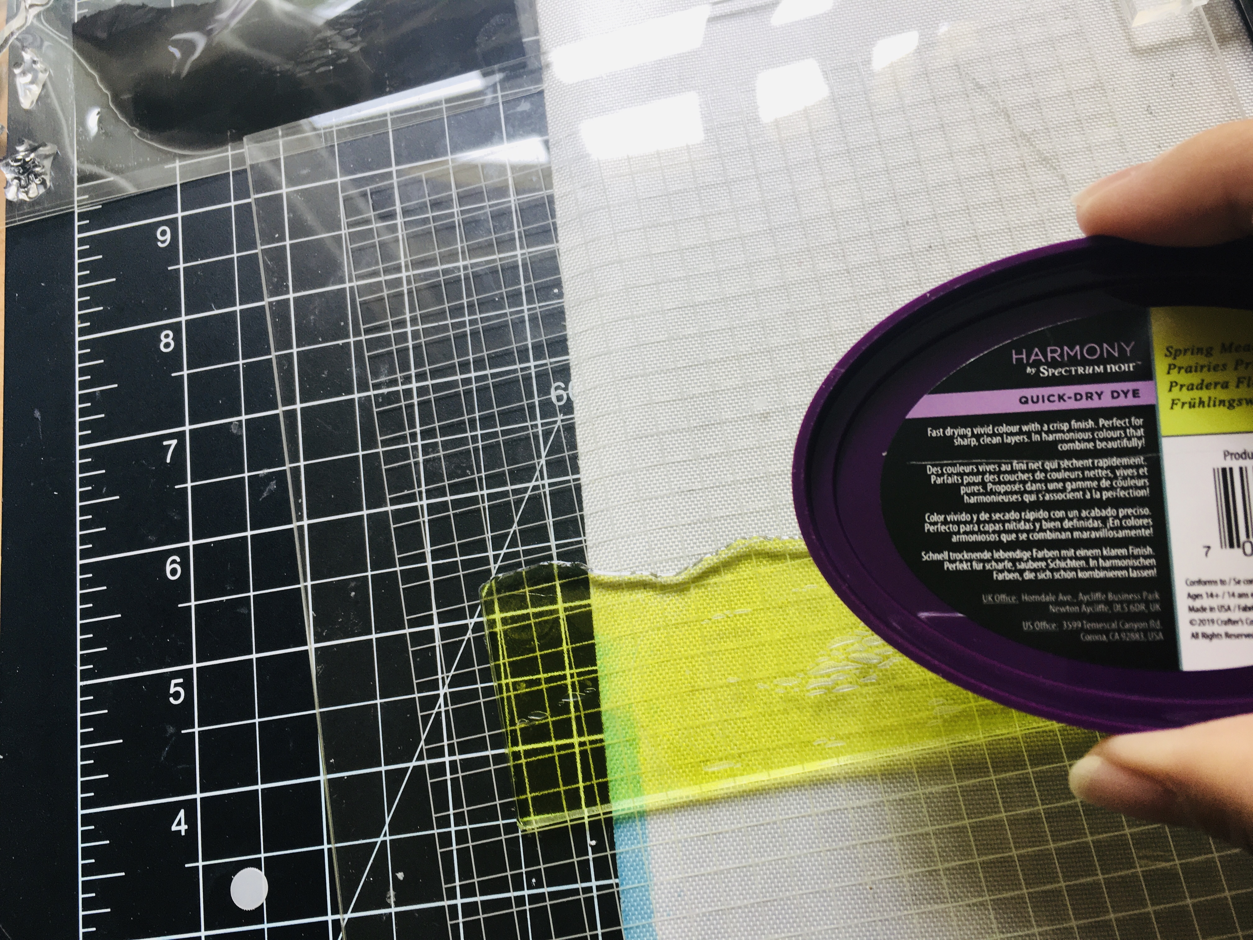 I used the Circle Frame dies to die-cut the window in the middle of my A2-size card stock. I used the Hills & Grass stencil with some dye inks to create my scene. I also inked-up the circle die-cut using the same Hills & Grass stencil with the Clouds stencil to continue the design for a more cohesive look.