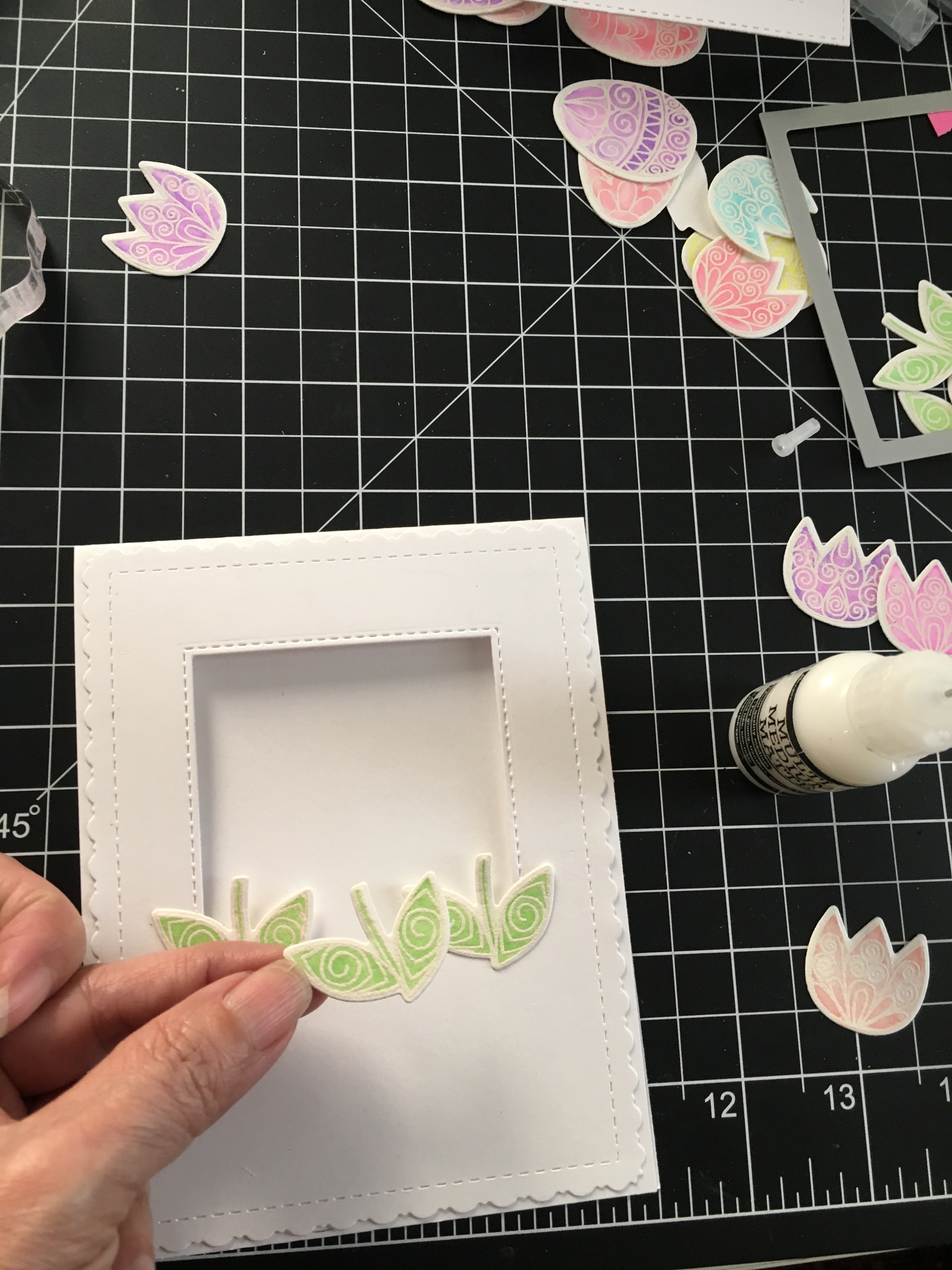 I wanted to create a window for my card and so I have used some of my square dies to die-cut the window panel.  I adhered the tulips with my adhesive, and covered the window with a pink square frame.