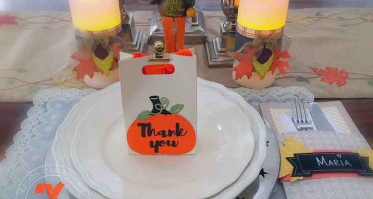 Since I have some leftover leaves that I die-cut from a previous project, I decided to make some place card holders, that will hold the utensils and a note pad for my guests to write what they are thankful for this year.  Here’s what it looks like: