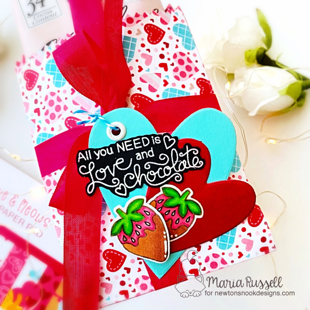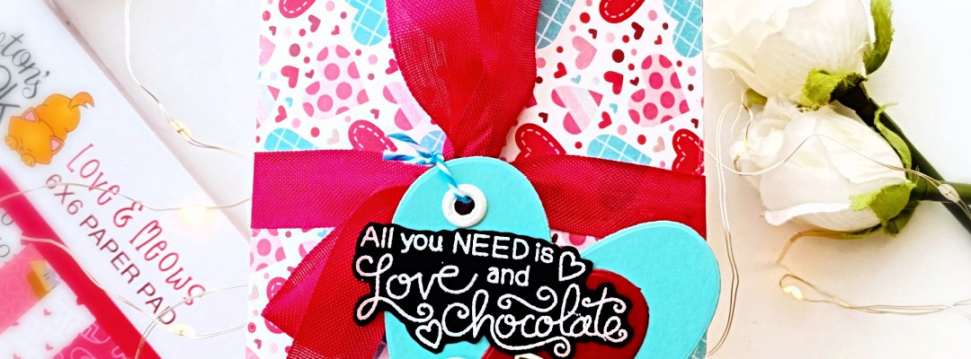 I bought a bunch of these Pink Chocolate Bars and gift cards at Michael’s and I thought I’d give them away to my friends for Valentine’s Day! I needed a cute gift bag to go with the treat so I thought I’d use the Love & Meows 6×6 Paper Pad. Here’s how I made the project: