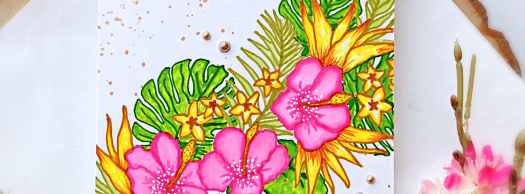 The next card looks complicated but trust me, it’s really easy! I started by stamping the image using the Tropical Floral Slimline stamp set with some Coffee Bean Hybrid Ink. Coloring the image was very easy because I used the Tropical Floral Slimline Layering Stencil Set with some Hybrid inks (colors mentioned below). Let me tell you, this was a huge GAME CHANGER! I love, love, love the layering stencils!