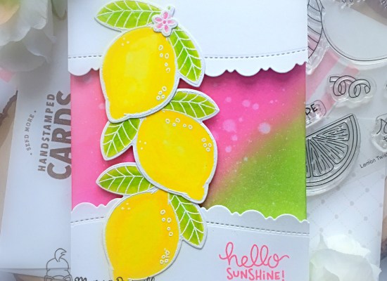 To finish my design, I stamped the sentiment “hello sunshine” with my Picked Raspberry distress oxide ink. I also used my white gel pen and added dots to the lemons to add more texture. Here’s a closer look:
