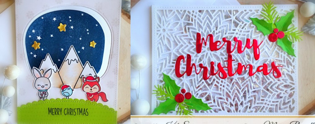 Since my design team package got a little delayed getting to me, I am on catch up mode. I created two projects for you guys because I really wanted to show them off! For my projects today, I am featuring the Holly Leaves and Berries die set, Fancy Floral Coverplate die, Merry Critters stamp set, Avery Elle Starry Scene stamp set, 6mm Sparkling clear solid confetti, Metallic Silver Solid Star Confetti, Stitched Scalloped Border Dies and a bunch of other products available at the shop.