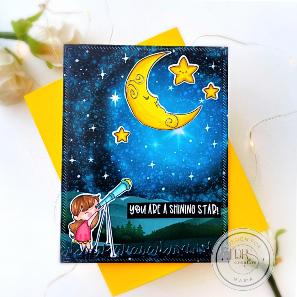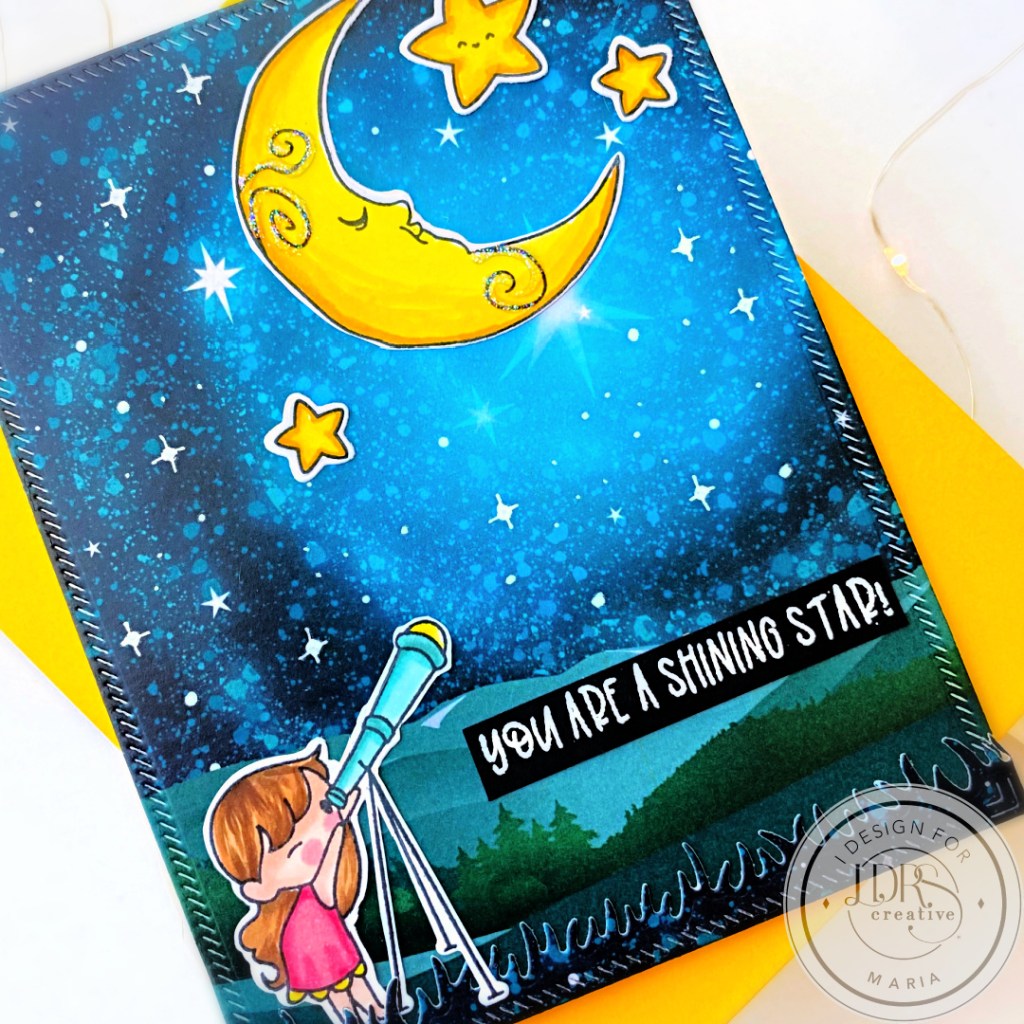 The scallop frame was created using the Mixed Scallop Rectangle Die, with the A2 Diagonal Stitched Layered Card Topper. I adhered the acetate sheet and added foam adhesive to create the well. I used iridescent sequins for my shaker element and adhered the frame to an A2-size top-folding notecard. I added the colored images using liquid glue.