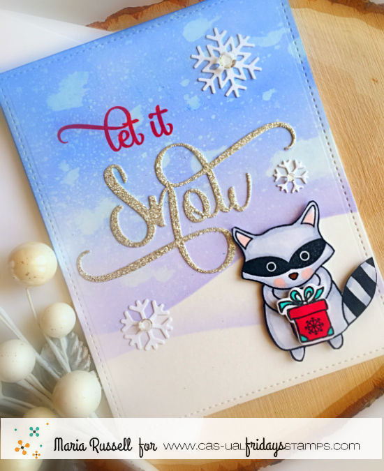 For my second card, I inked up my Bristol smooth white card stock with Blueprint Sketch and Shaded Lilac distress oxide inks. I stamped, colored and die-cut my little Racoon from the Bushy Tailed stamp set. I also die-cut the sentiment “Snow” on some glittered card stock.
