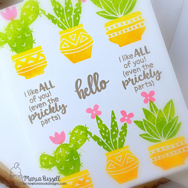 I finished my design by using my white gel pen to add some dots on the cacti and stamped the sentiment with some Versafine ink in Onyx black.