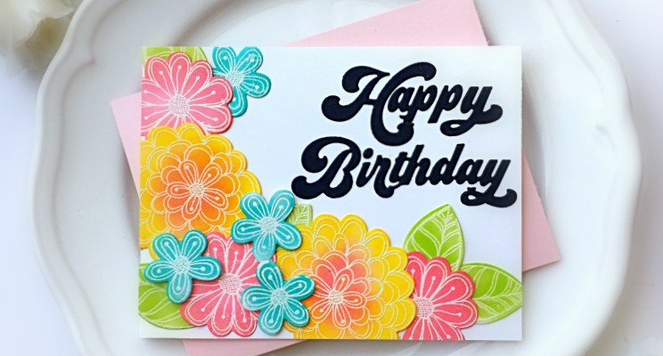 To finish my design, I die-cut the Happy Birthday on black card stock and adhered on the card with liquid adhesive.