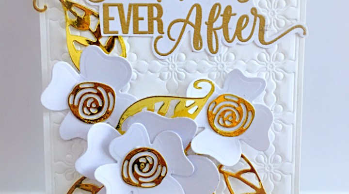 I ink-blended an A2 size panel of Bristol smooth white card stock and used some clouds and hills stencil to create the background. I die-cut the A2 Hearts Panel die with some white card stock and foam-mounted this panel. I carefully inserted the bunnies and adhered using foam adhesive.