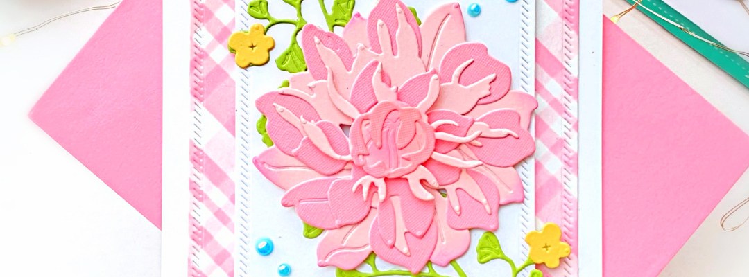 - using two shades of pink card stock, die-cut the flower using the Dahlia Layering Dies. Adhere the first layer with foam adhesive for added dimension, and adhere the rest with liquid glue.