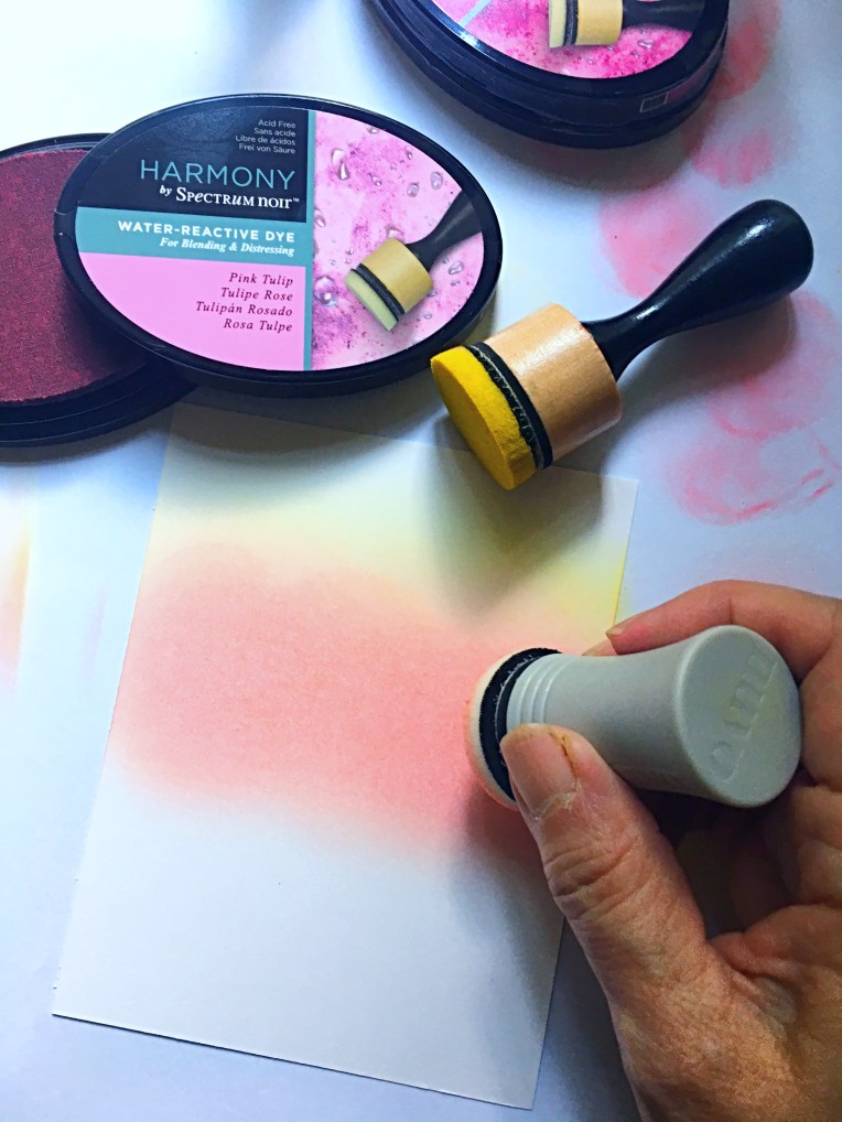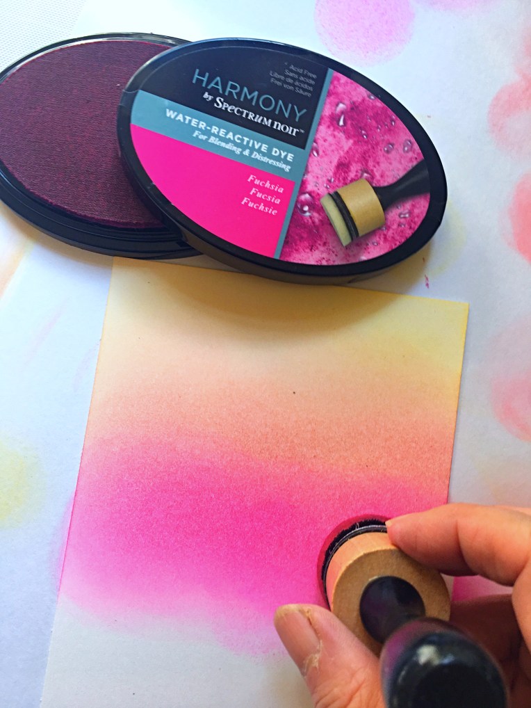 On an A2-size piece of Bristol Smooth white card stock, I ink-blended my background using some Harmony Water Reactive Inks in Straw Bale. I the light pink colorwith the SN Water Reactive Ink in Pink Tulip.