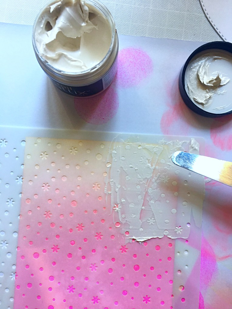 To create my snow, I used Newton’s Nook Petite Snow stencil with Deco Foil Metallix Gel in Pearl White.